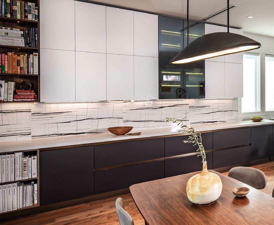 La cocina es un espacio abierto diseñado para conectarse con el desayunador, por eso utilizamos el mismo concepto para ambas áreas. Se utilizó la línea Henzo para tener un aspecto moderno y limpio, evitando el uso de manijas.