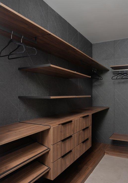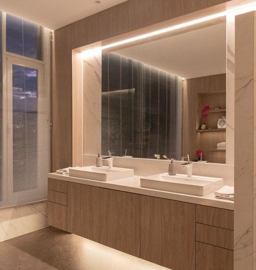 Los principales materiales utilizados son: piedra, mármol, madera natural y vidrio bronce, dispuestos en la medida justa que crea un lenguaje armónico en toda la casa.