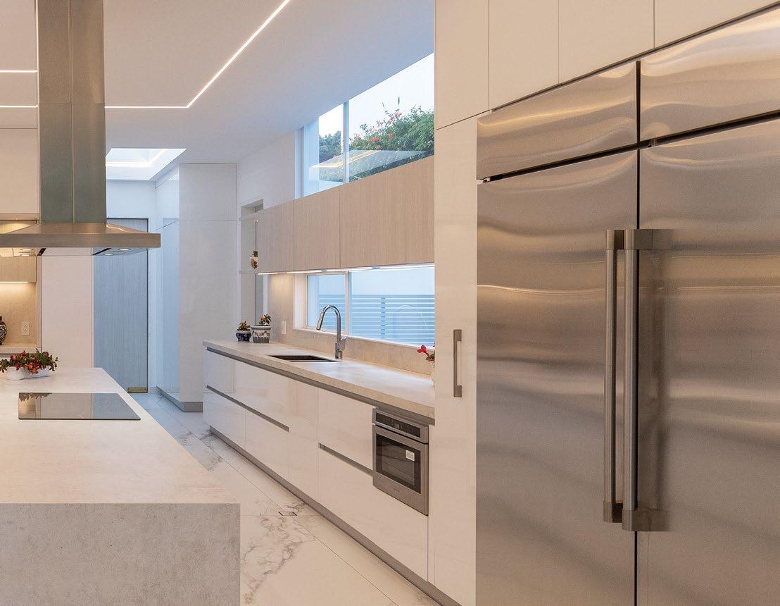 laca chimborazo brillante / melamínico gales / perfil gola negro mesón de porcelanato/ herrajes Blum / refrigeradora panelada Madeval