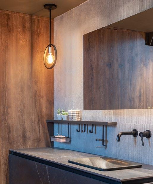 krono system syros gold / melamina plomo corrugado / mesón Dekton Keyla de Cosentino / horno + microhondas HomeDreams / campana D’Kocina /