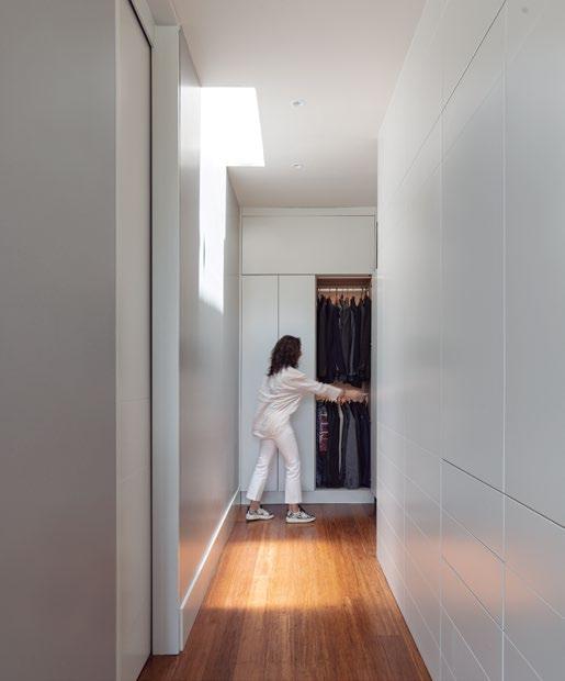 Partiendo de la analogía de los olores y su neutralización con el café, este pasillo central trabaja como un eje cafetero, siendo un recibidor con transición obligatoria entre espacios “neutralizando” el cambio realizado entre ambientes de cocina y vestidor. También se refuerza este concepto con una textura rugosa que recorre paredes y tumbados que contrasta con la homogeneidad de las cocinas intervenidas.