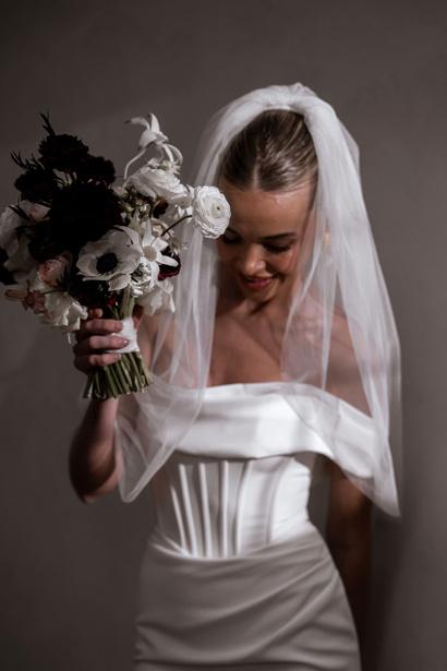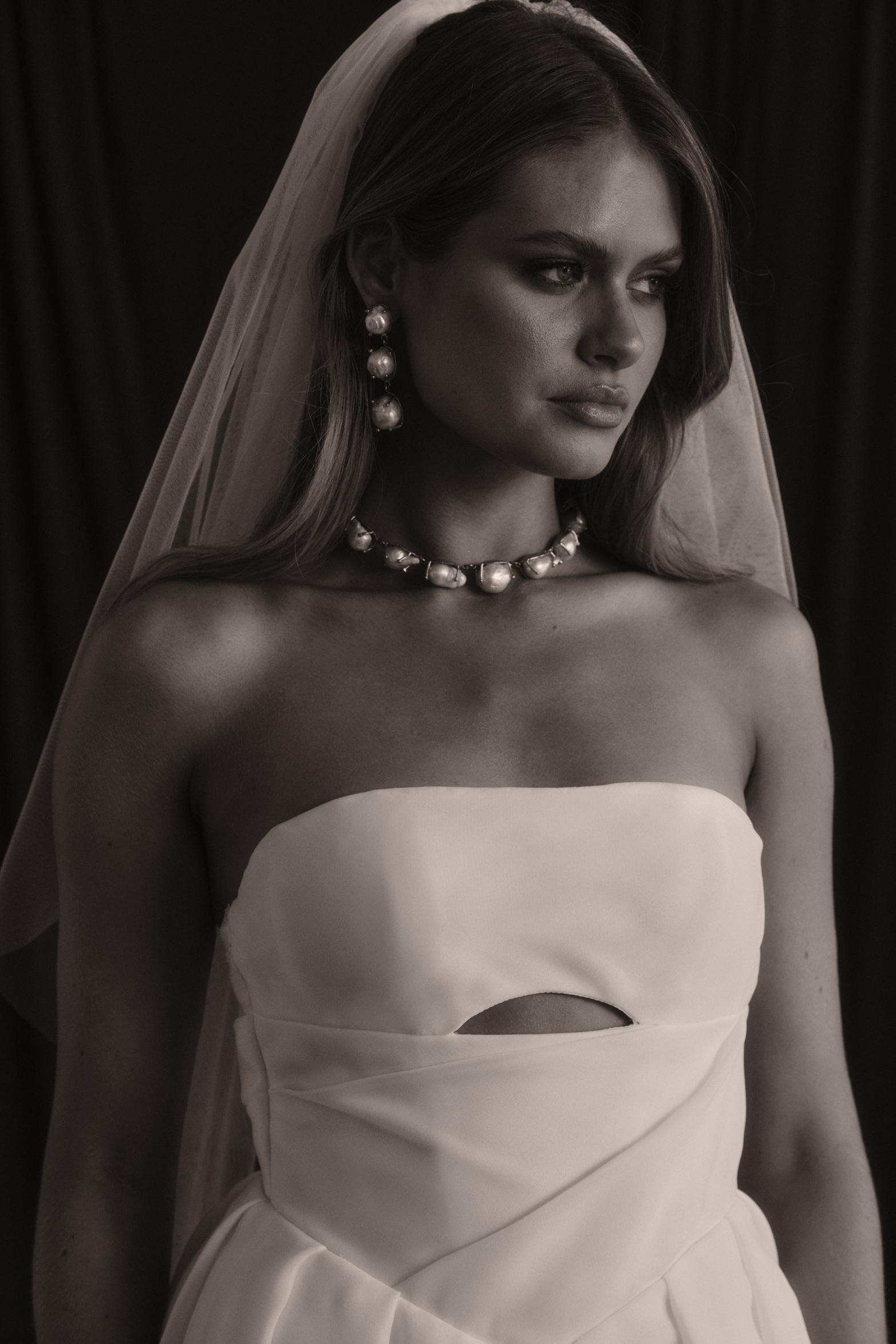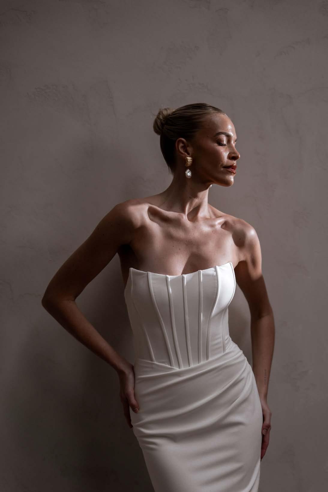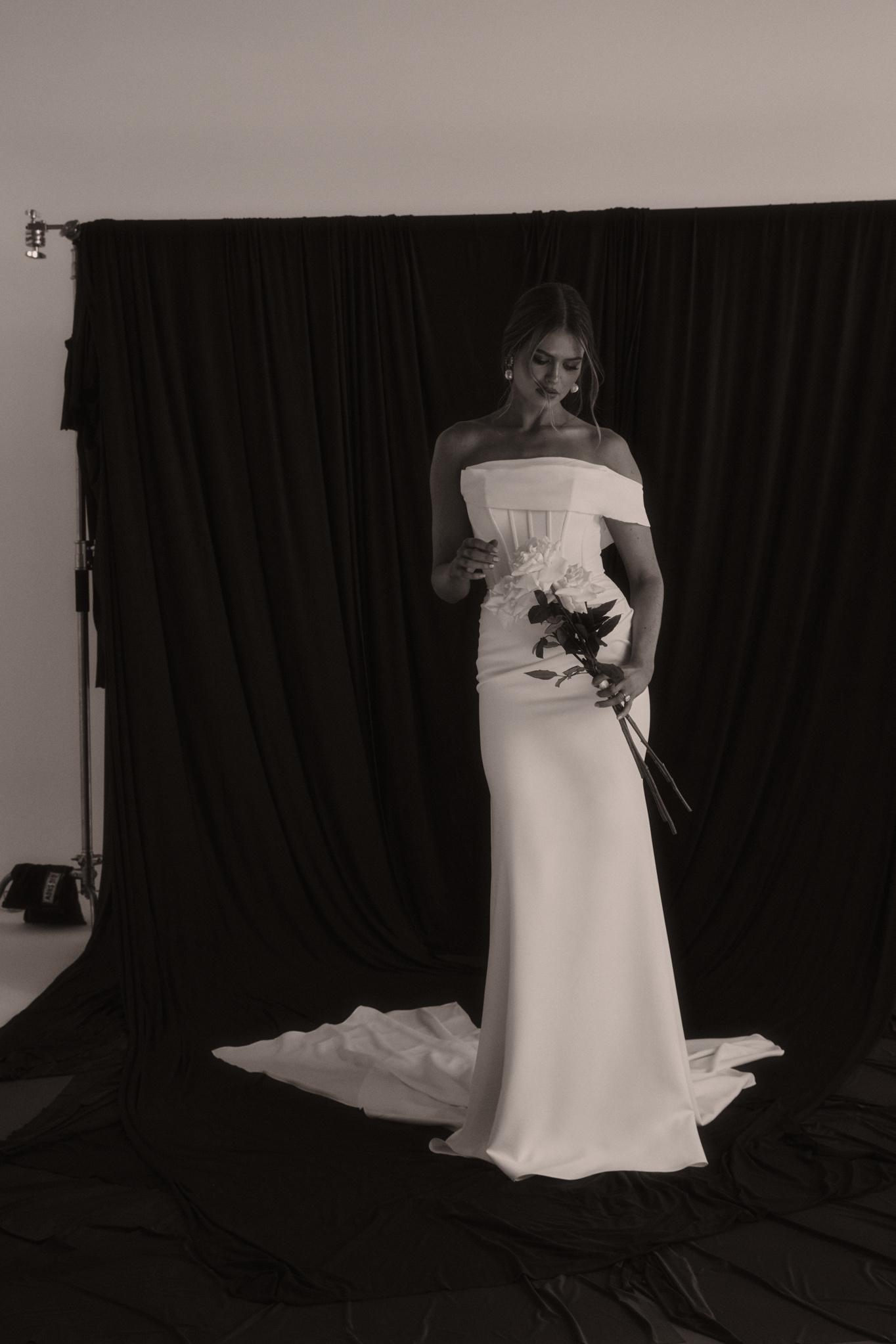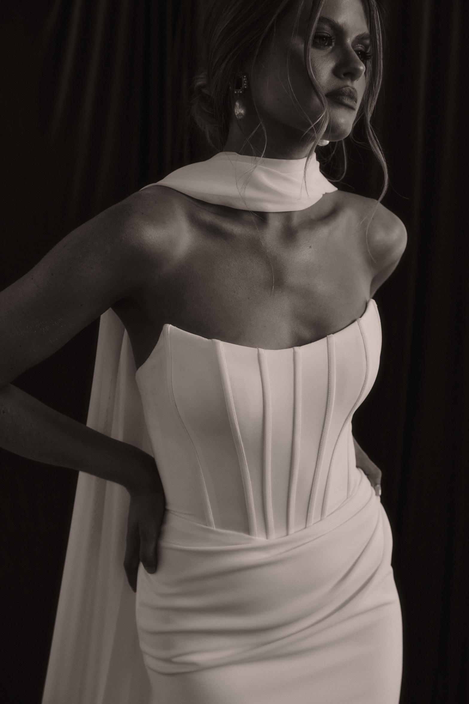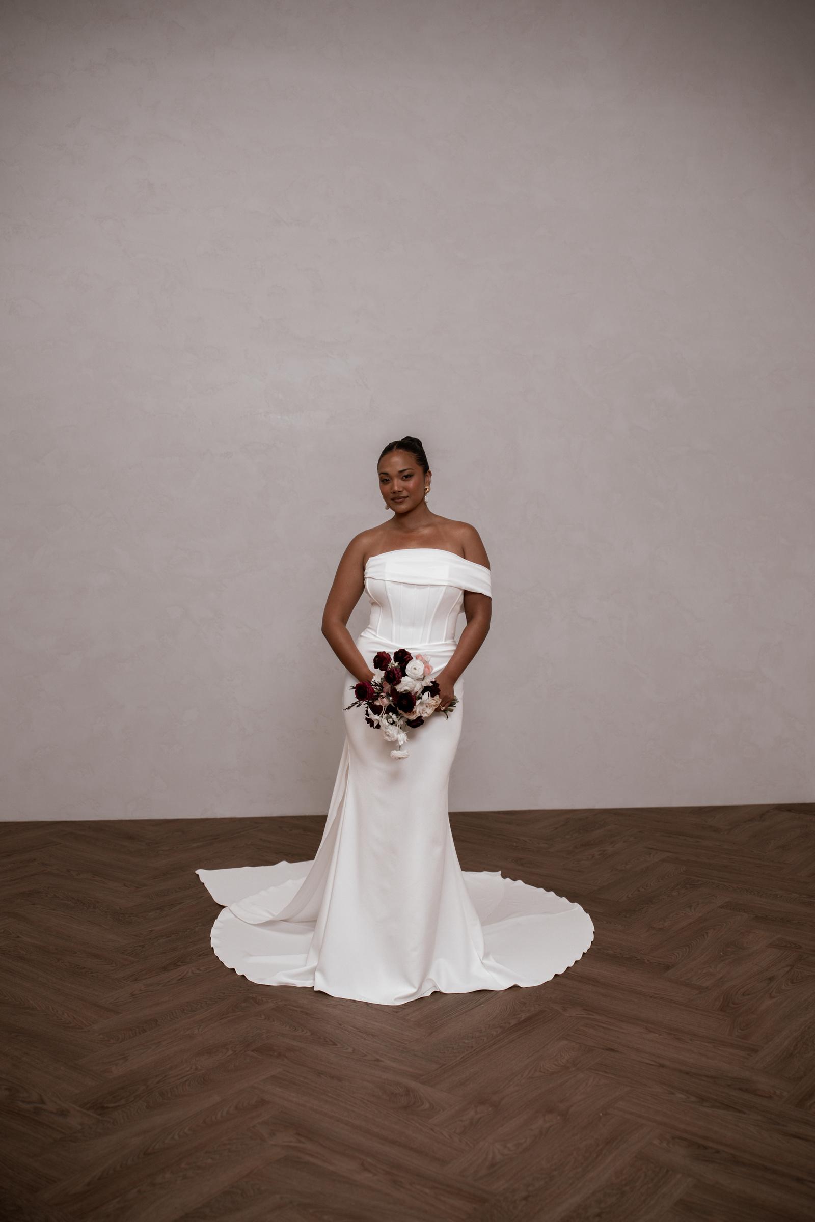 Rhode is breathtaking strapless crepe wedding dress that effortlessly combines modern elegance with timeless romance. The striking bodice features a peaked design at the bust with statement exposed boning, sculpting your silhouette with an alluring yet refined edge. Soft French crepe draping cascades gracefully from the waist to the hips, creating a flattering silhouette that moves beautifully with every step keeping you comfortable and confident.