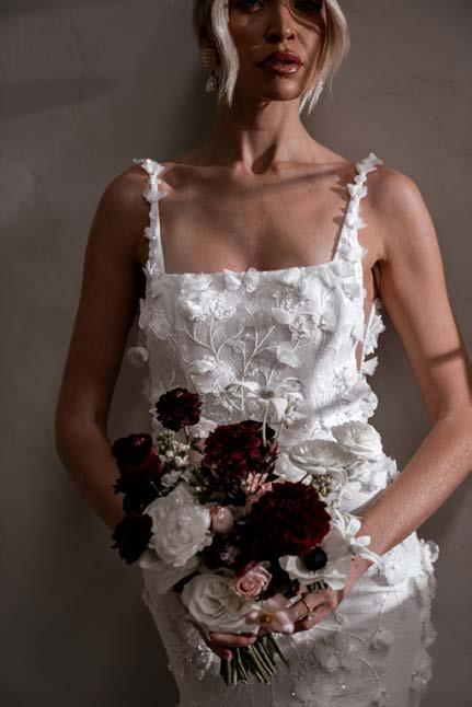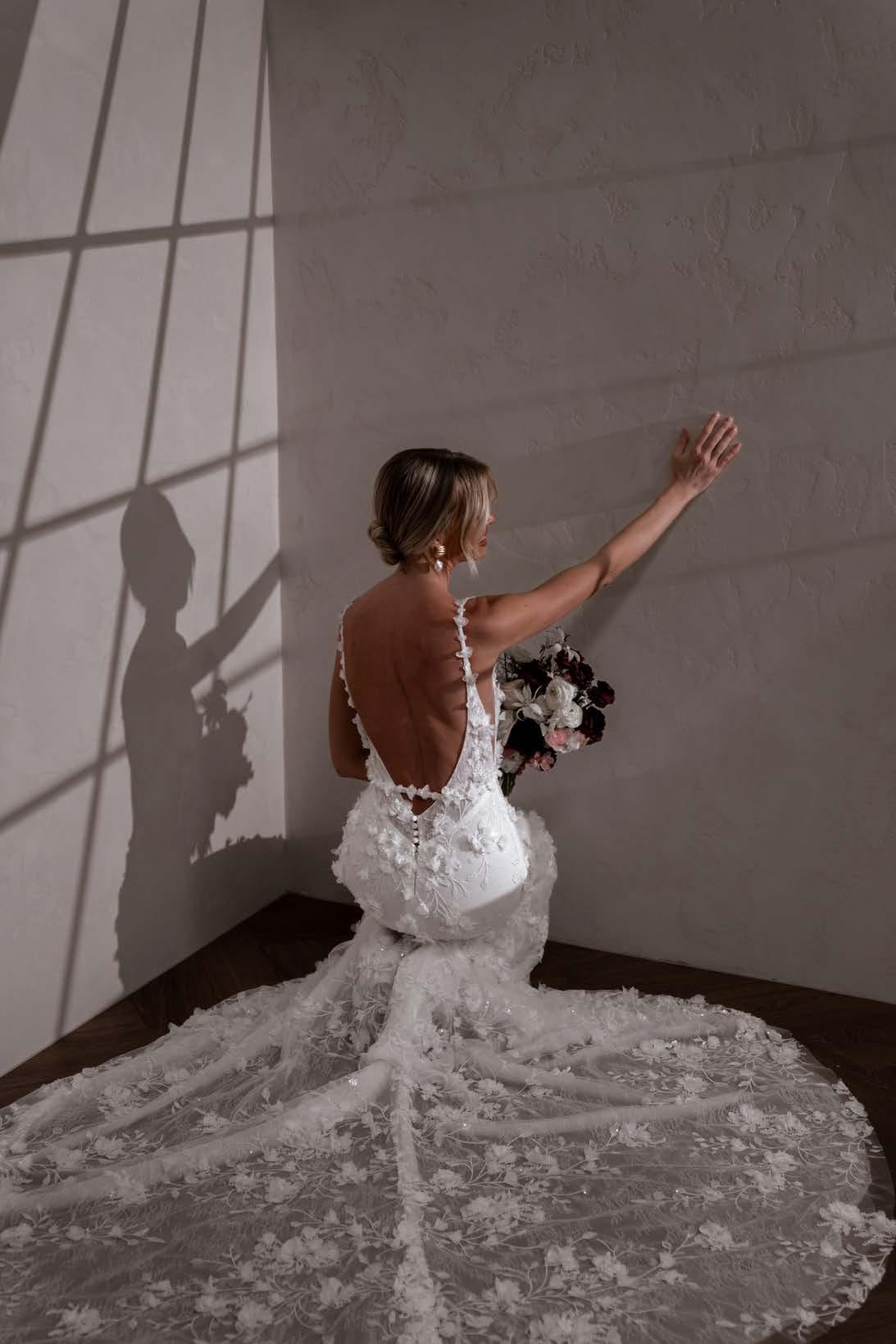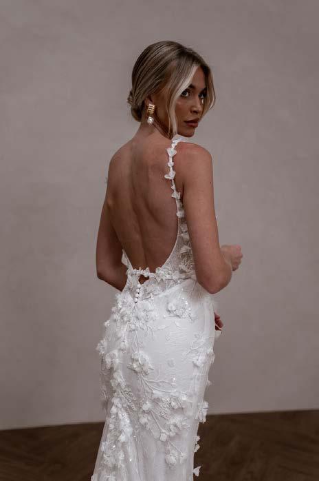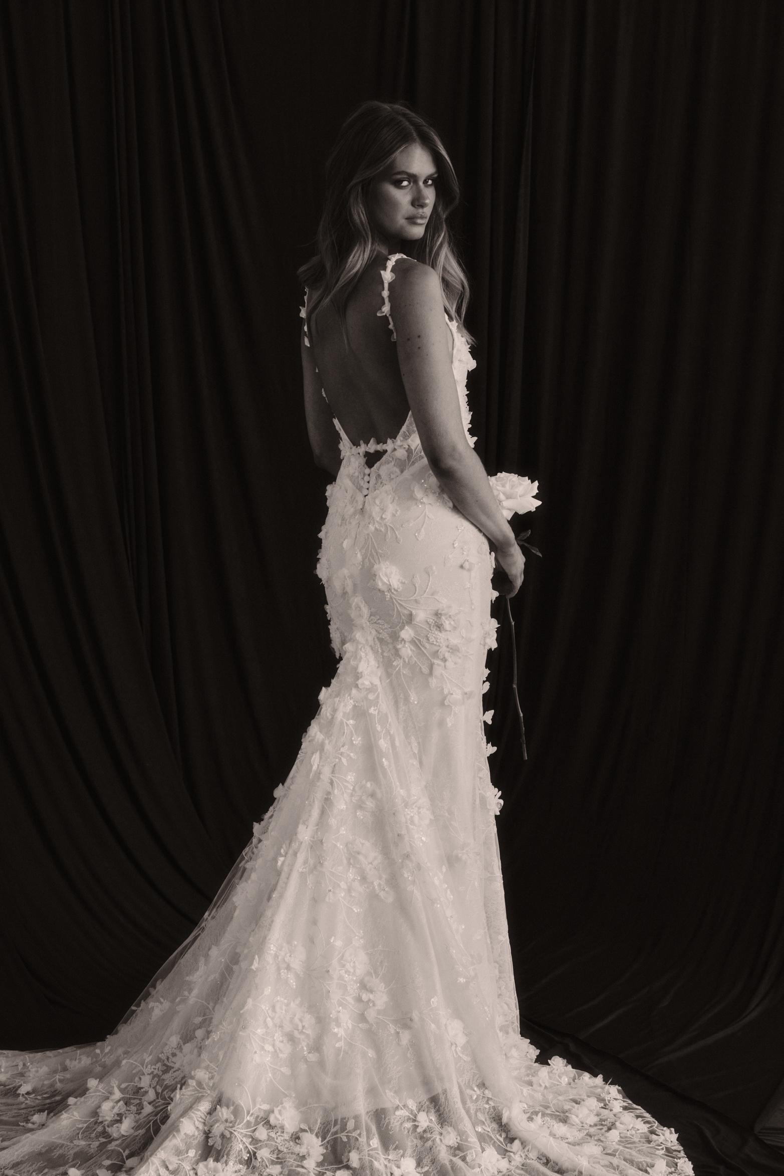 Atlas features a strong square neckline that adds a contemporary edge, framing the face with a bold and striking line. This architectural detail is complemented by her signature low back that exudes allure, showcasing a graceful illusion cut-out and delicate button detailing. Crafted from our neverbefore-seen exquisite 3D embroidered petal lace, Atlas brings a touch of nature’s beauty to your special day. Her fitted skirt hugs the body beautifully, creating a flattering silhouette that accentuates your curves, while her long train adds a dramatic flair that will have you gliding down the aisle.