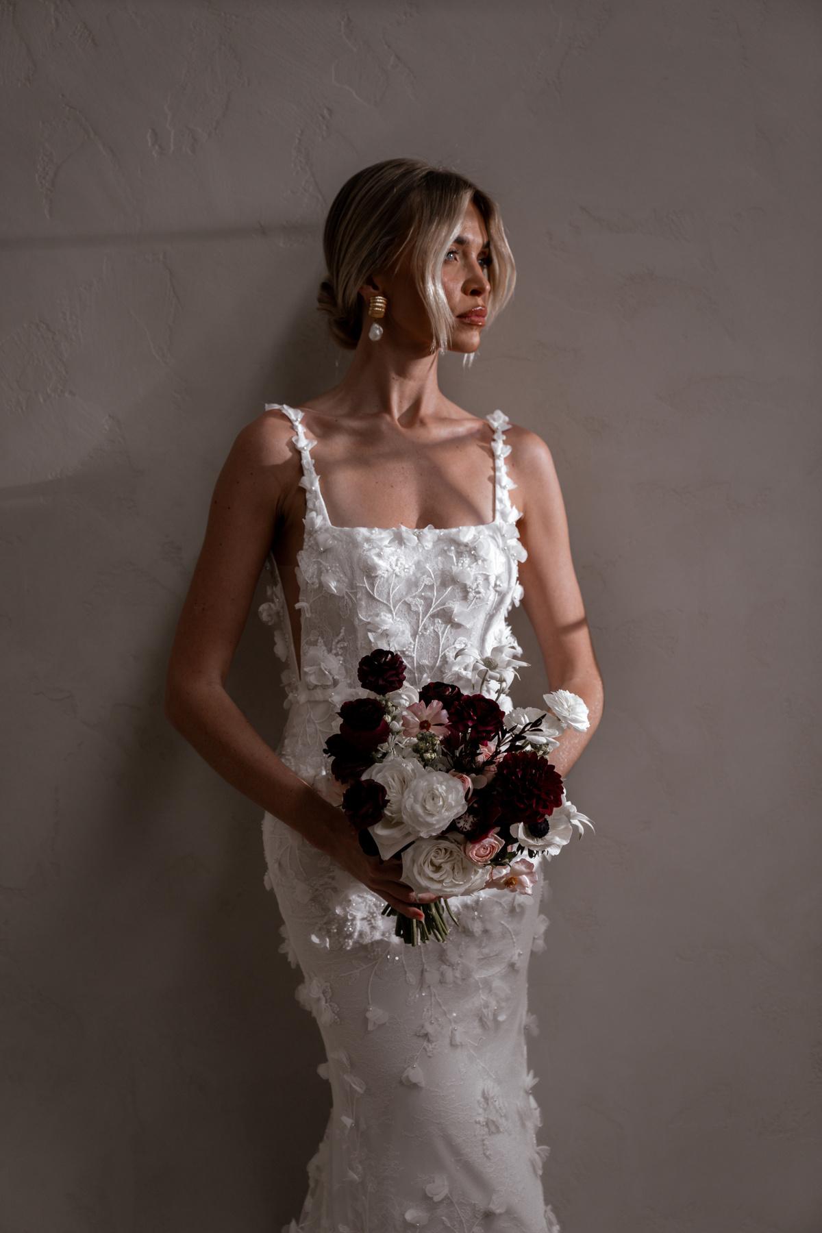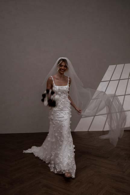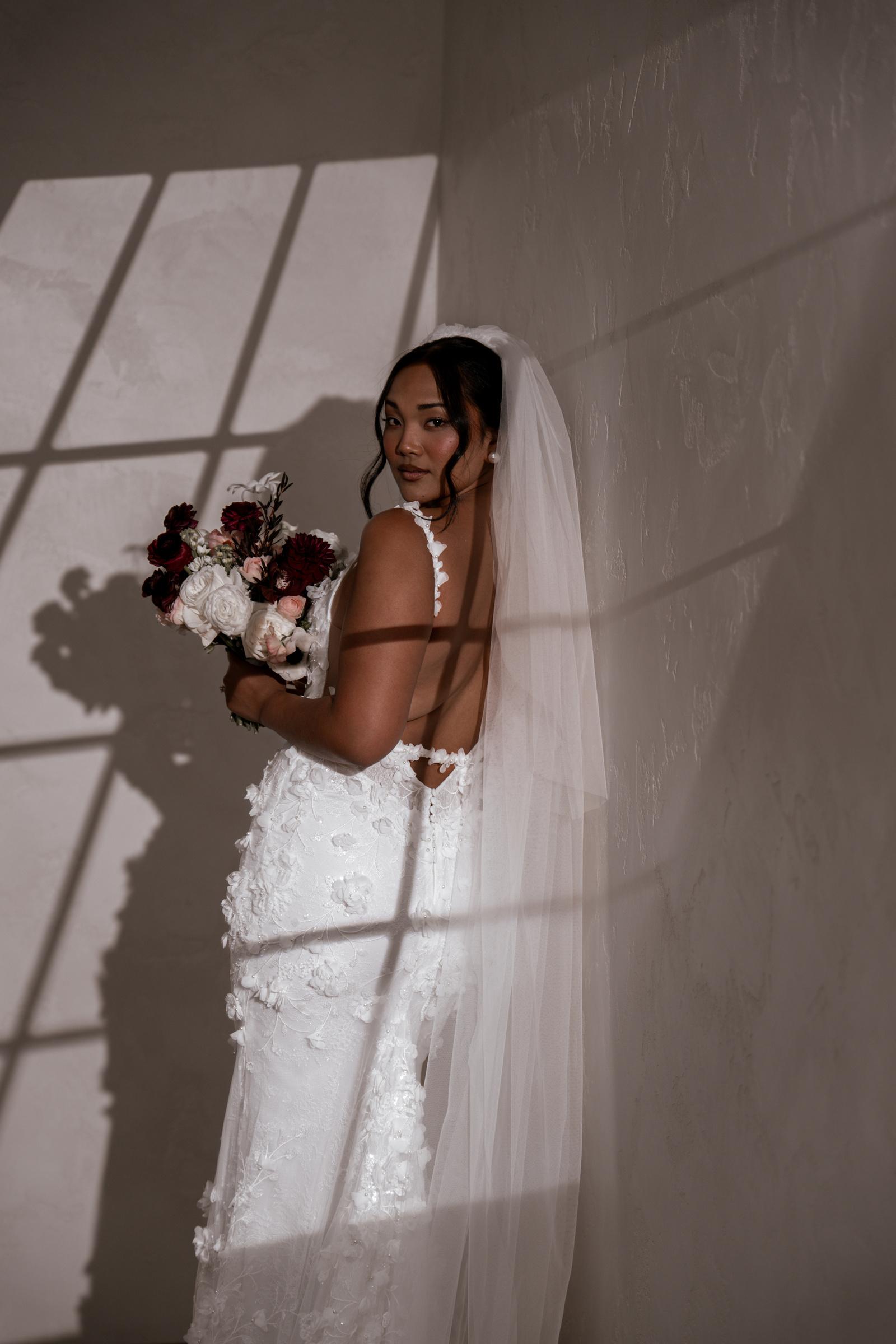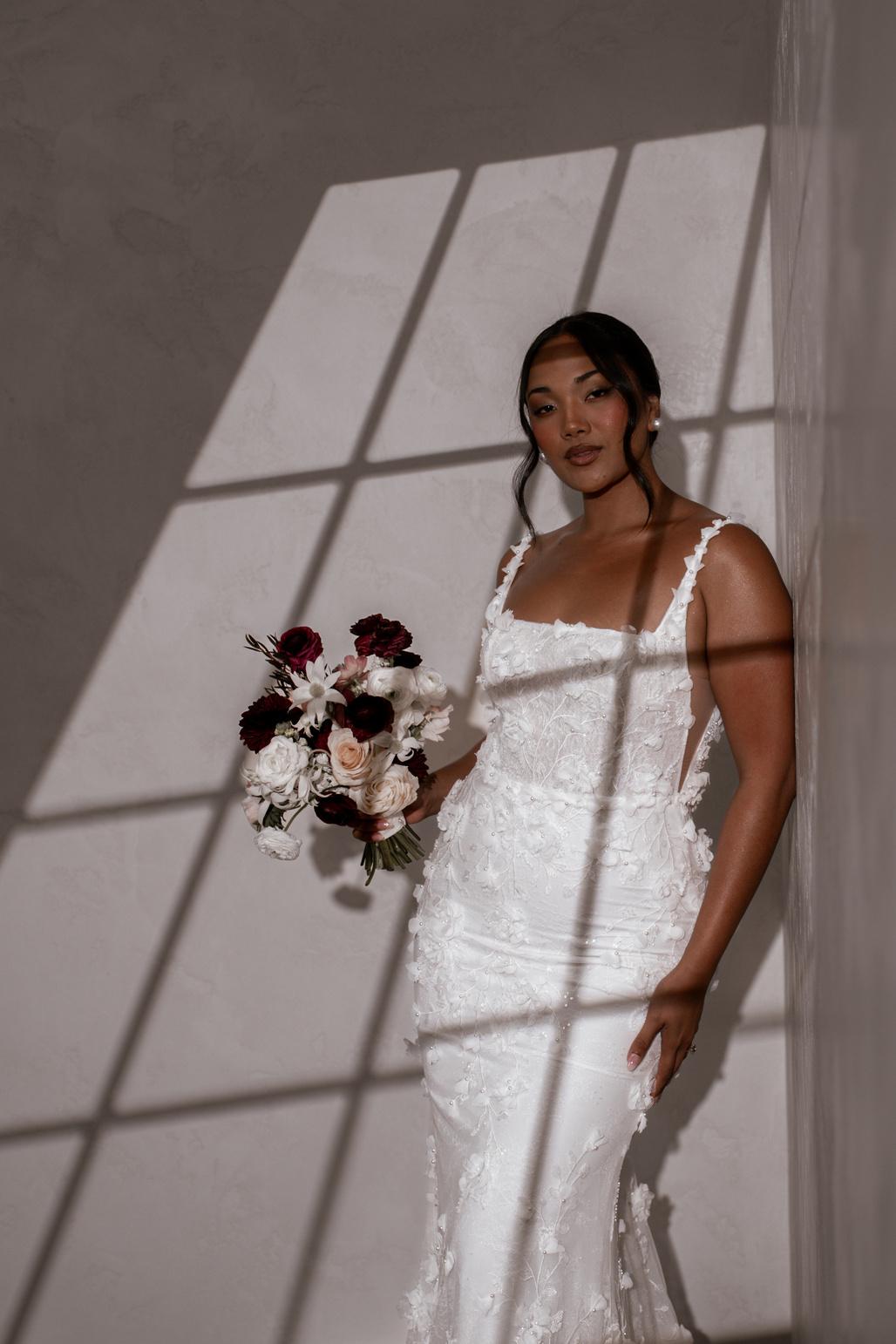 Atlas features a strong square neckline that adds a contemporary edge, framing the face with a bold and striking line. This architectural detail is complemented by her signature low back that exudes allure, showcasing a graceful illusion cut-out and delicate button detailing. Crafted from our neverbefore-seen exquisite 3D embroidered petal lace, Atlas brings a touch of nature’s beauty to your special day. Her fitted skirt hugs the body beautifully, creating a flattering silhouette that accentuates your curves, while her long train adds a dramatic flair that will have you gliding down the aisle.