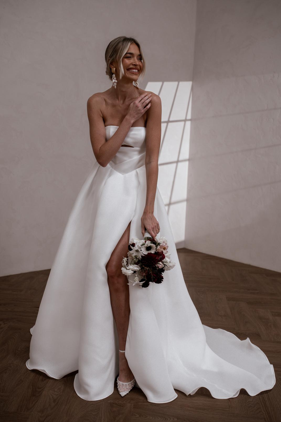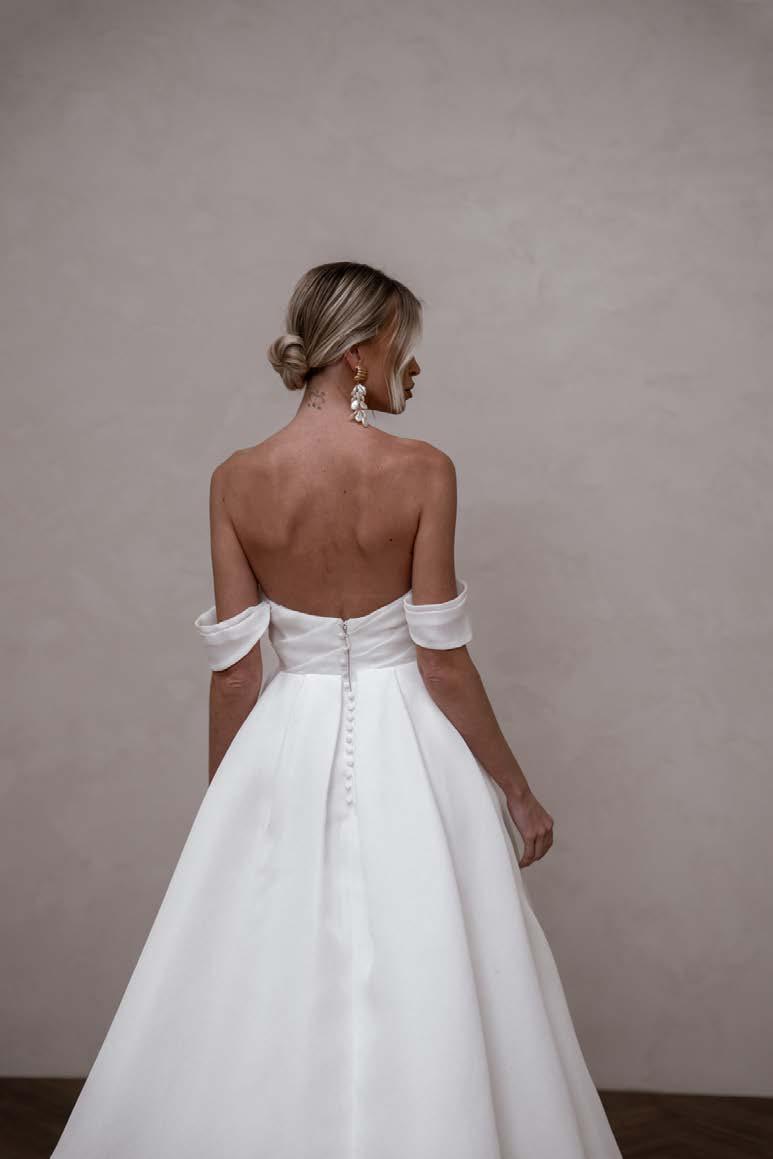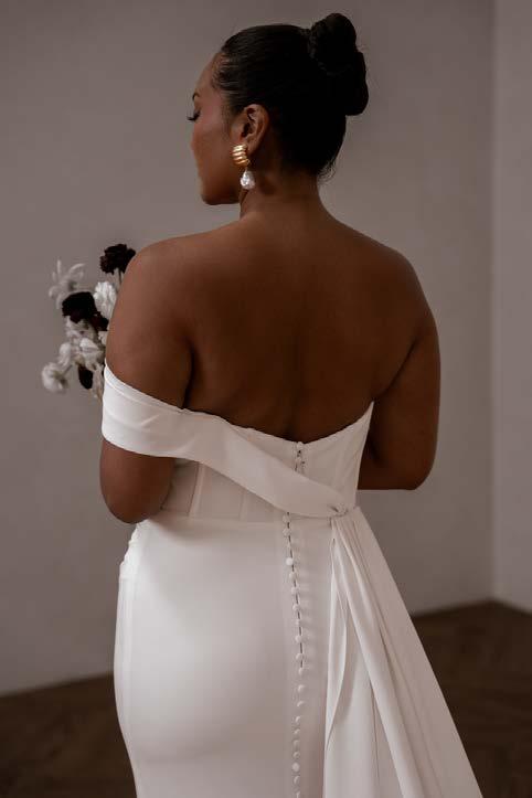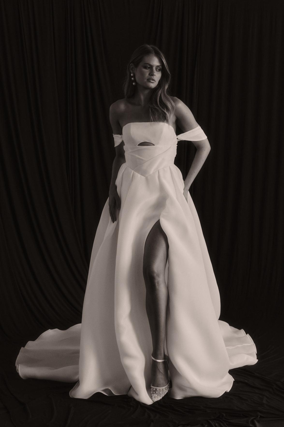 With a flattering basque waist and an optional high leg split for added allure, Sloane combines comfort with elegance. A unique cut-out detail adds a modern twist to this romantic design. Enhance her versatility with our detachable cuffs for a timeless off-the-shoulder look.