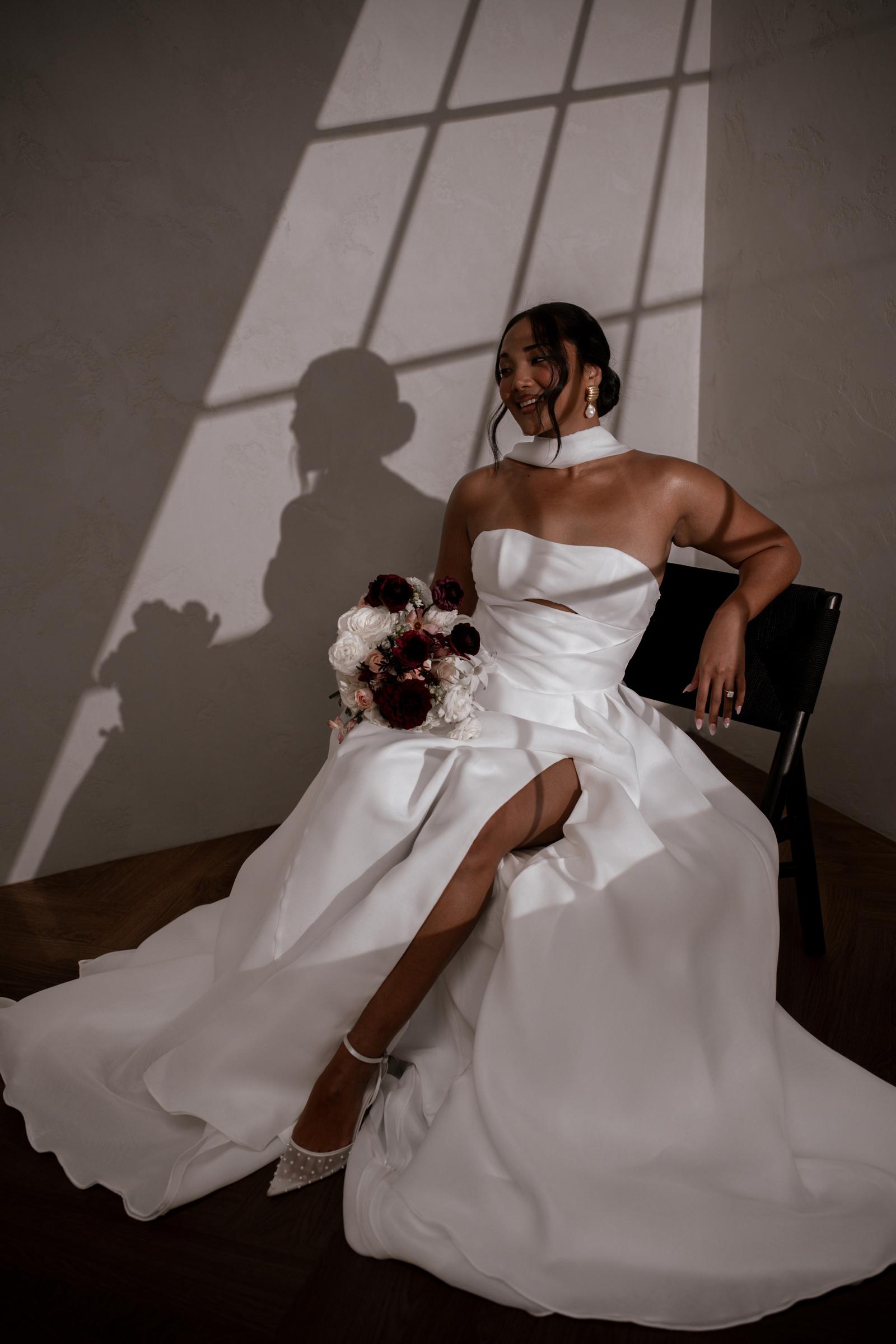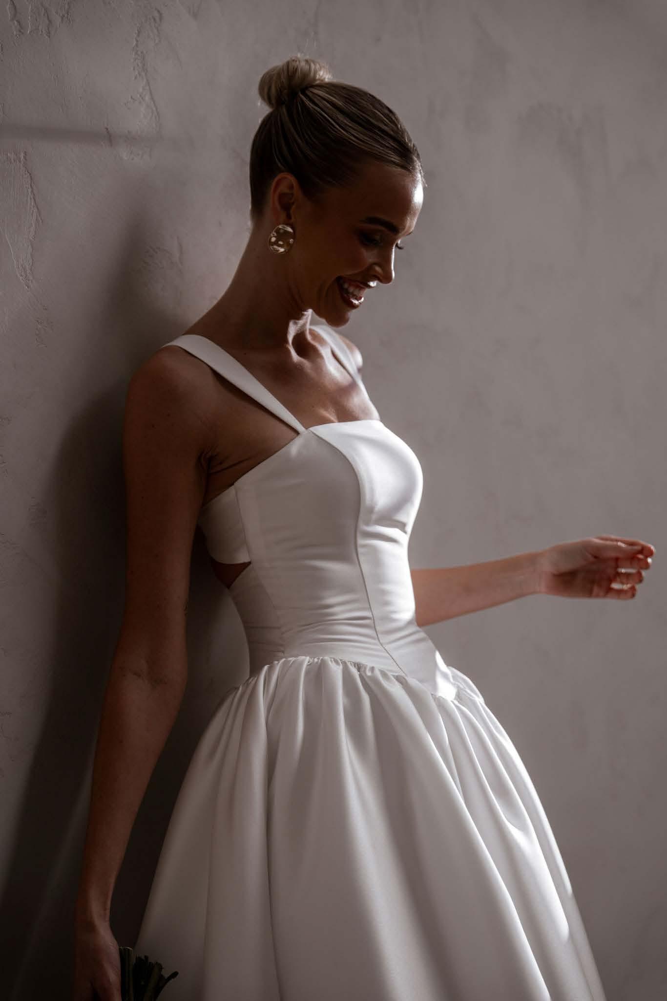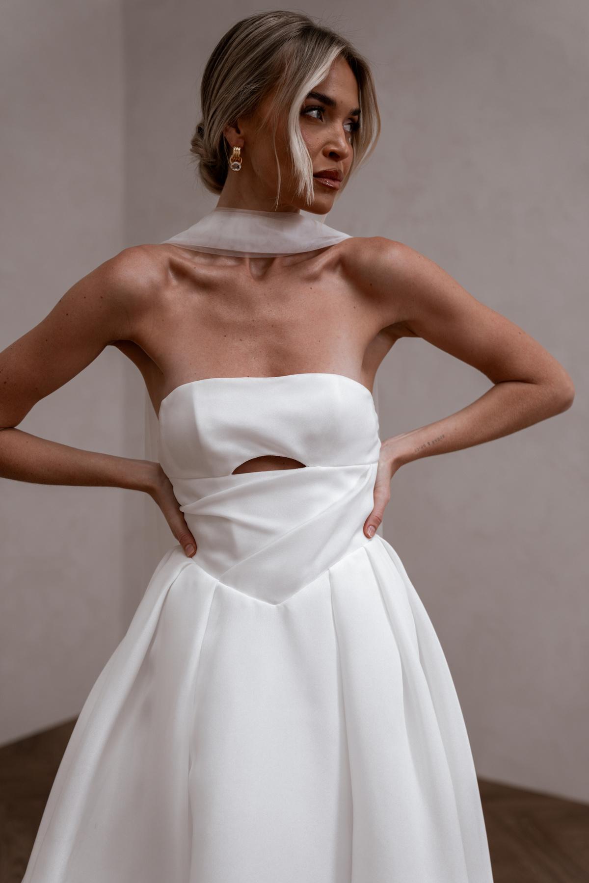 With a flattering basque waist and an optional high leg split for added allure, Sloane combines comfort with elegance. A unique cut-out detail adds a modern twist to this romantic design. Enhance her versatility with our detachable cuffs for a timeless off-the-shoulder look.