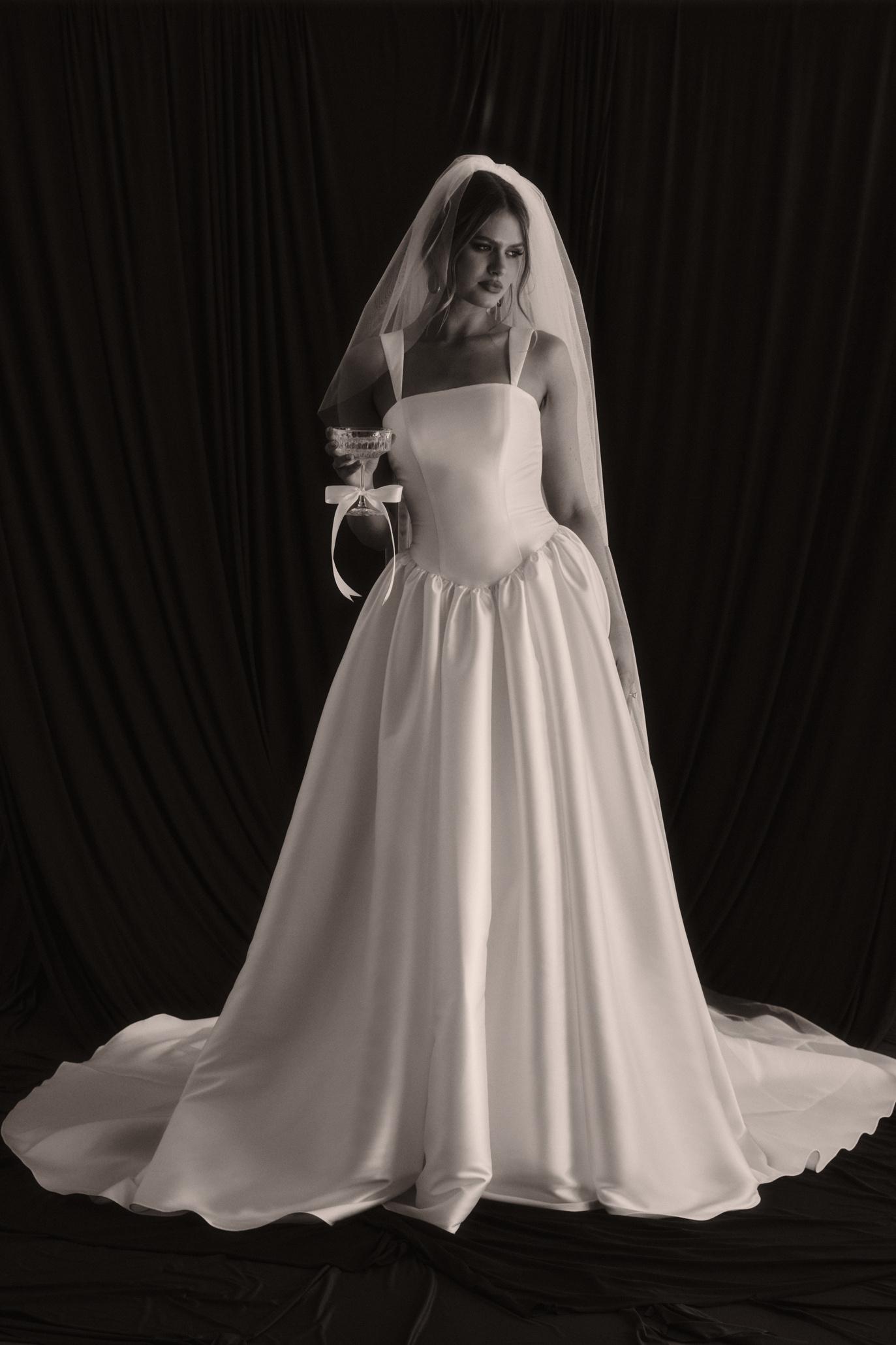 For added drama, this gown comes with a detachable train, allowing for a stunning entrance and an easy transition to celebrations later in the evening. The optional, detachable asymmetrical off-the-shoulder feature adds a touch of whimsy, beautifully framing the neckline and enhancing your bridal look. Designed for the contemporary bride, this dress is perfect for making a statement while offering versatility throughout your special day.