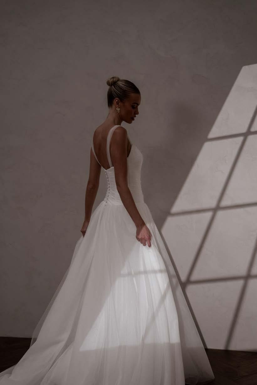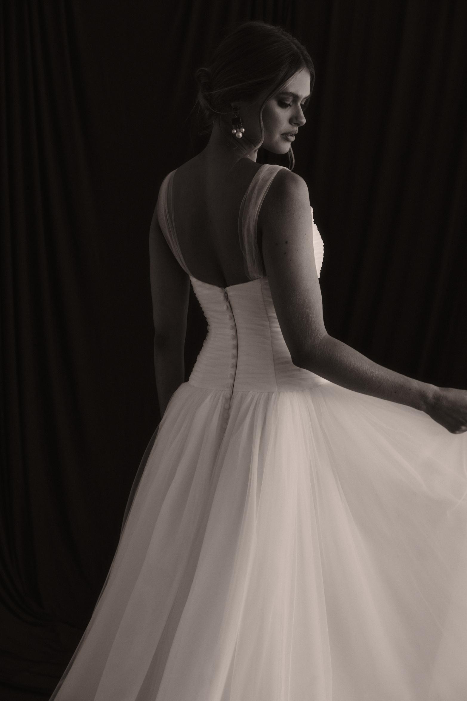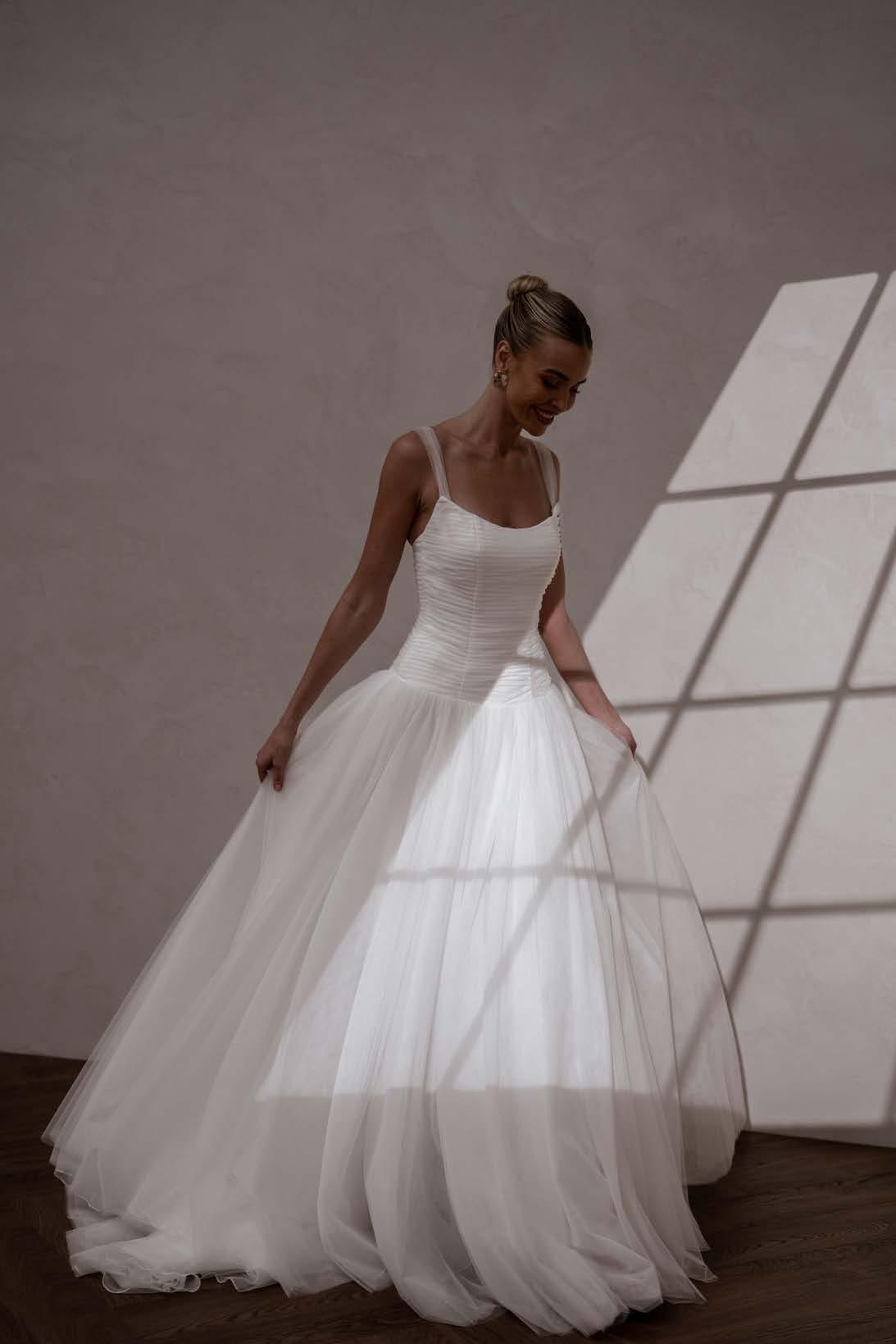 Our enchanting Aire features a peaked pleated tulle bodice that beautifully hugs the silhouette, creating an elegant and structured look. Her sophisticated drop waist adds a touch of modern flair, elongating the figure and gracefully transitioning to a soft, flowing A-line skirt. The subtle play of textures between her pleated bodice and soft tulle skirt creates a captivating contrast and ethereal effect as she moves. Her delicate tulle straps provide a feminine touch, accentuating the shoulders and adding a hint of whimsy.