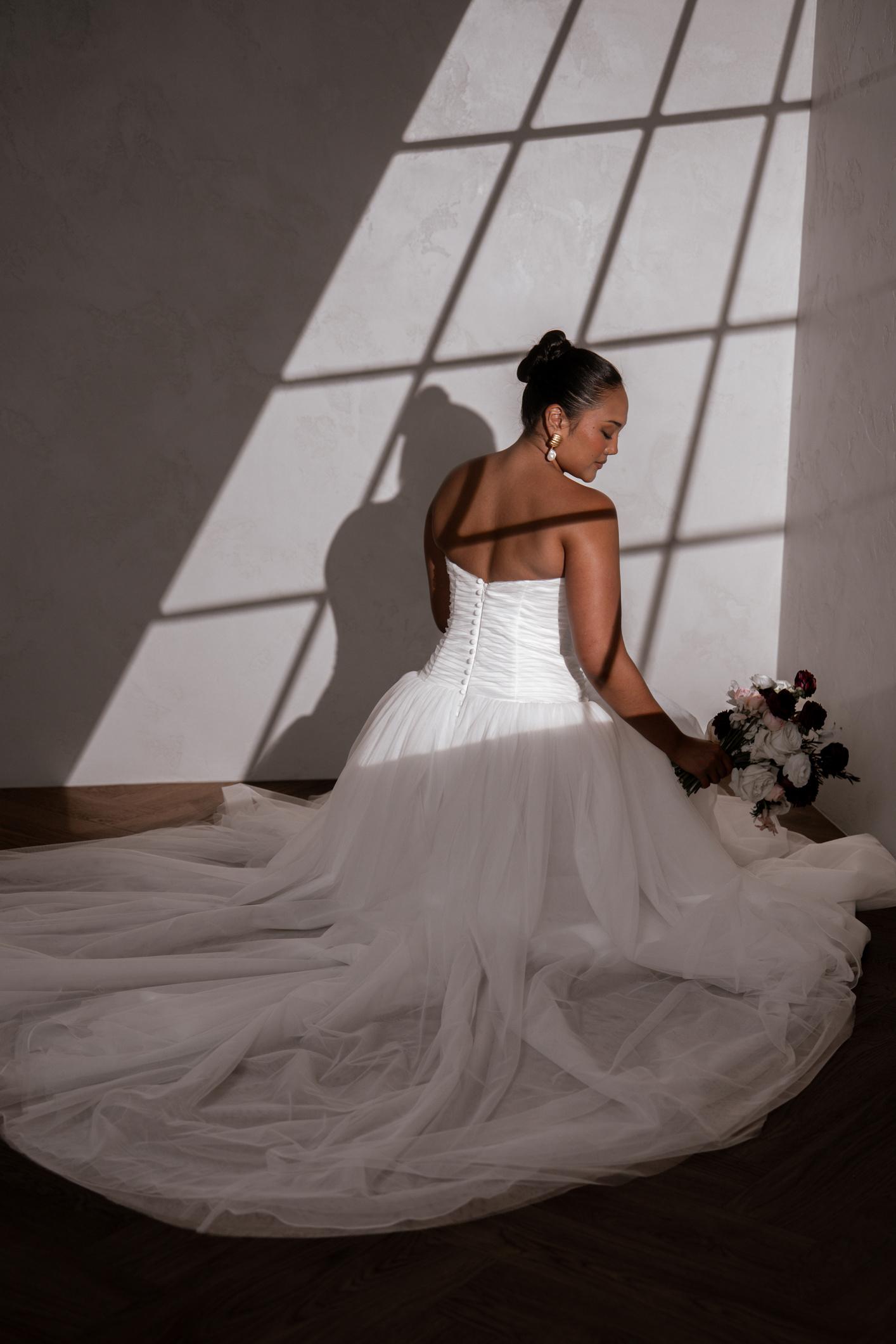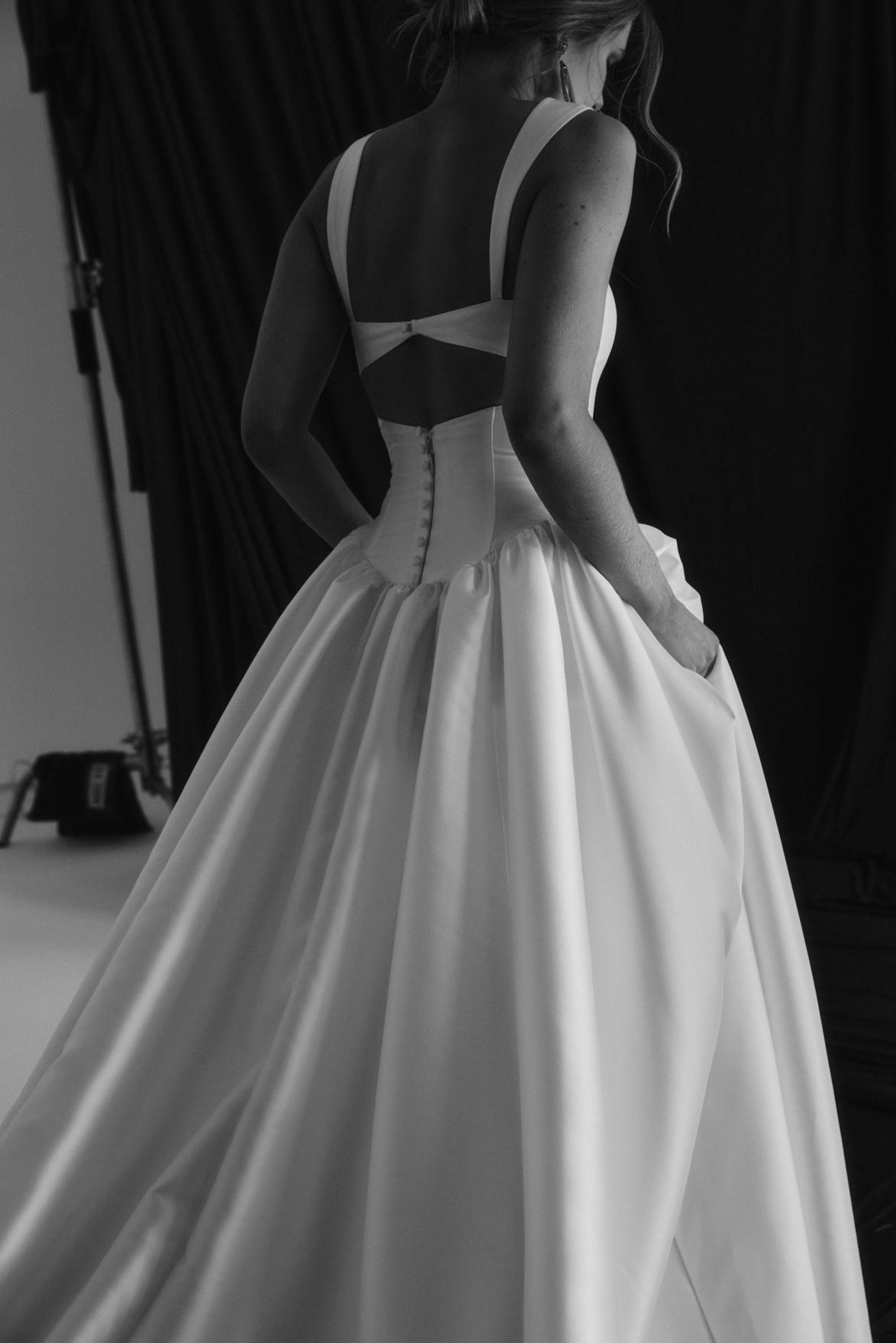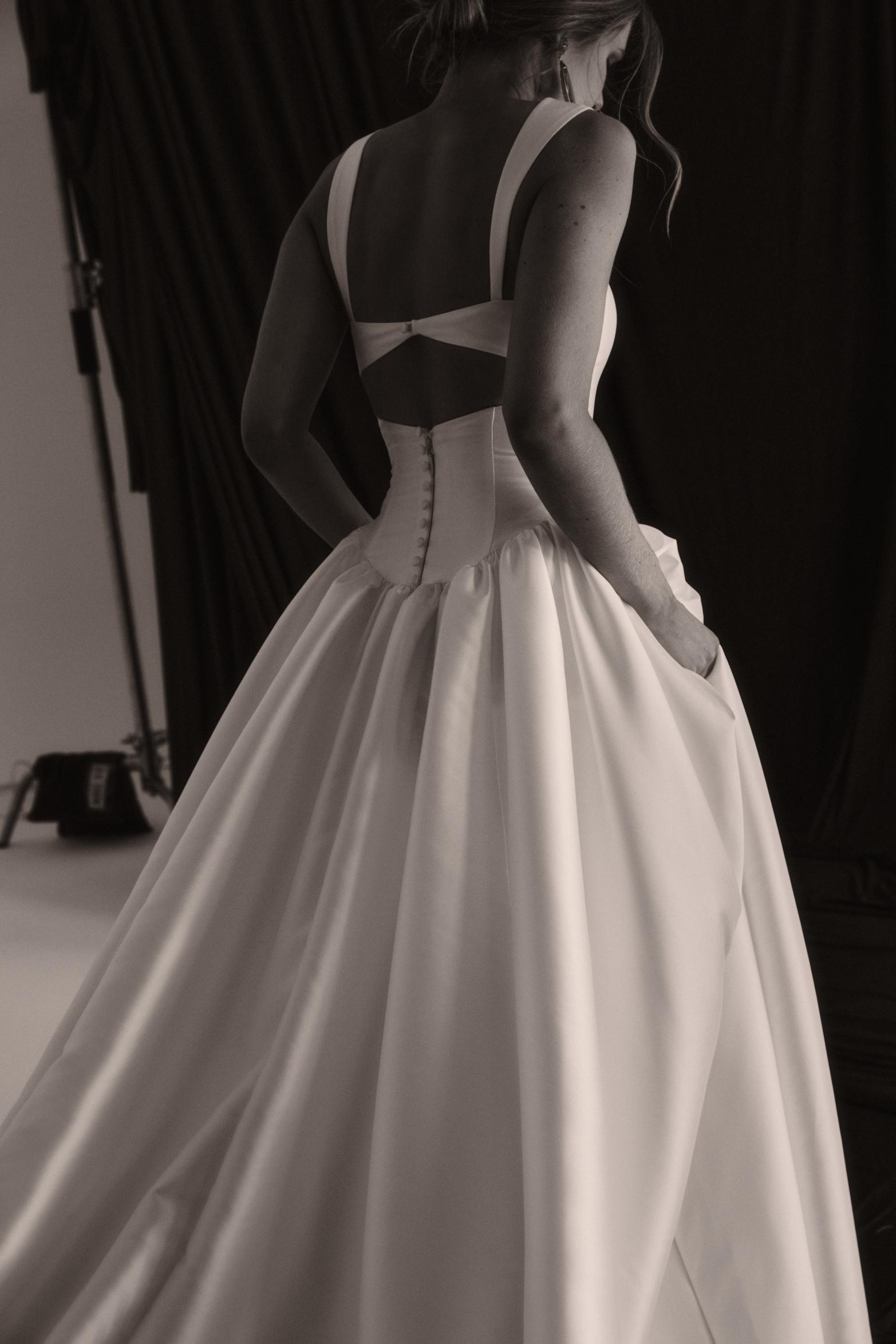 Introducing Raine: our new luxurious beauty mindfully crafted from signature MWL Mikado fabric, designed for the bride who exudes confidence and elegance. Her flattering drop waist and supportive structural boning creates an elongated, cinched silhouette that beautifully transitions into a contrasting voluminous full skirt with intricate pleating to further accentuate the feminine form.