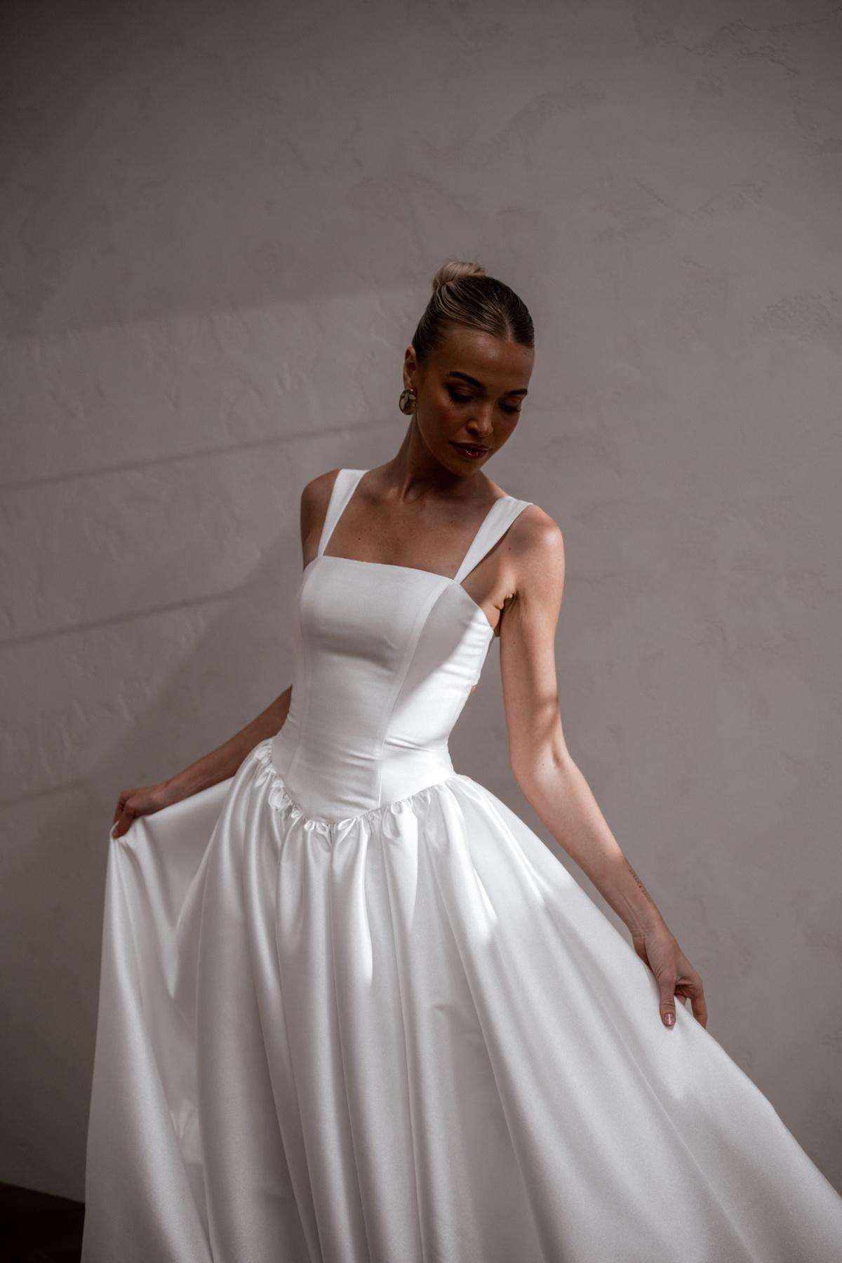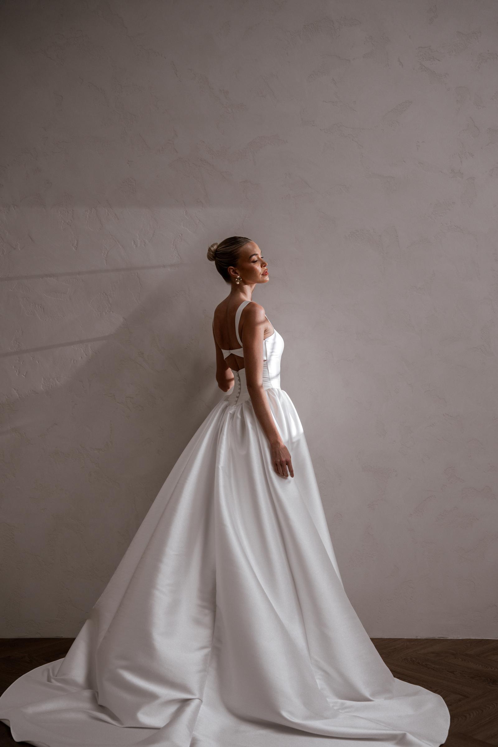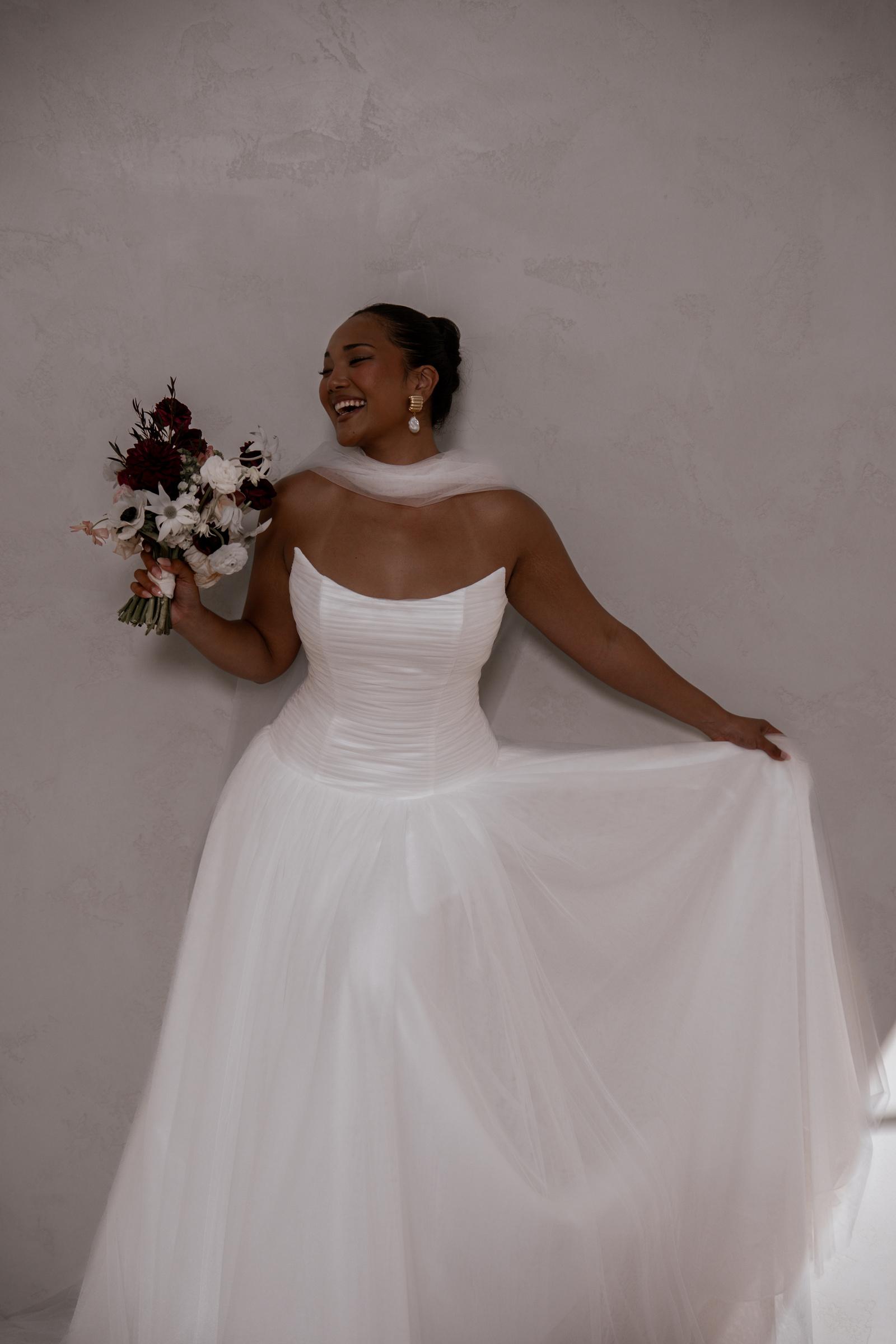 Introducing Raine: our new luxurious beauty mindfully crafted from signature MWL Mikado fabric, designed for the bride who exudes confidence and elegance. Her flattering drop waist and supportive structural boning creates an elongated, cinched silhouette that beautifully transitions into a contrasting voluminous full skirt with intricate pleating to further accentuate the feminine form.