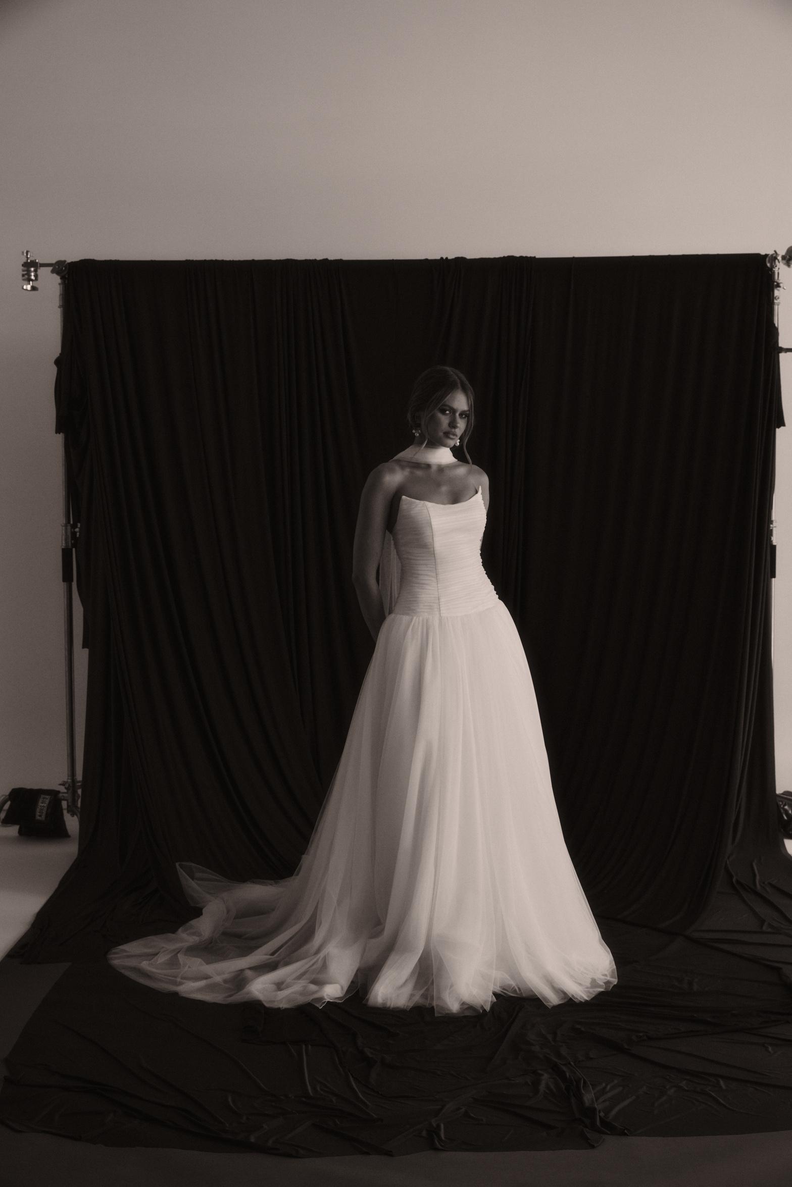 Experience the enchanting beauty of Sloane, designed to captivate with her ethereal charm and daring style. Her flowy organza skirt moves like water, creating a mesmerizing effect as you glide down the aisle. The lightweight fabric adds a dreamy shimmer and volume, while the strapless pleated bodice enhances feminine curves.