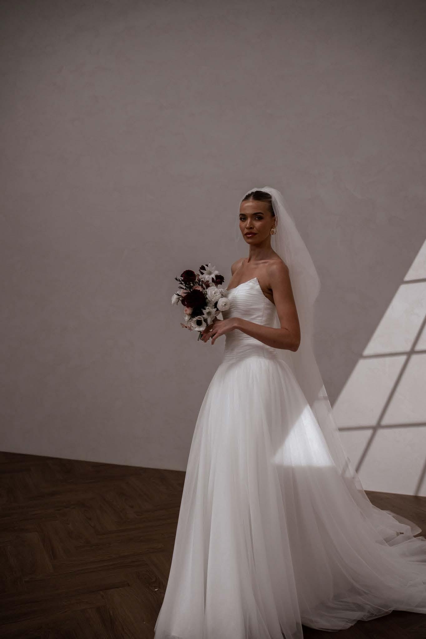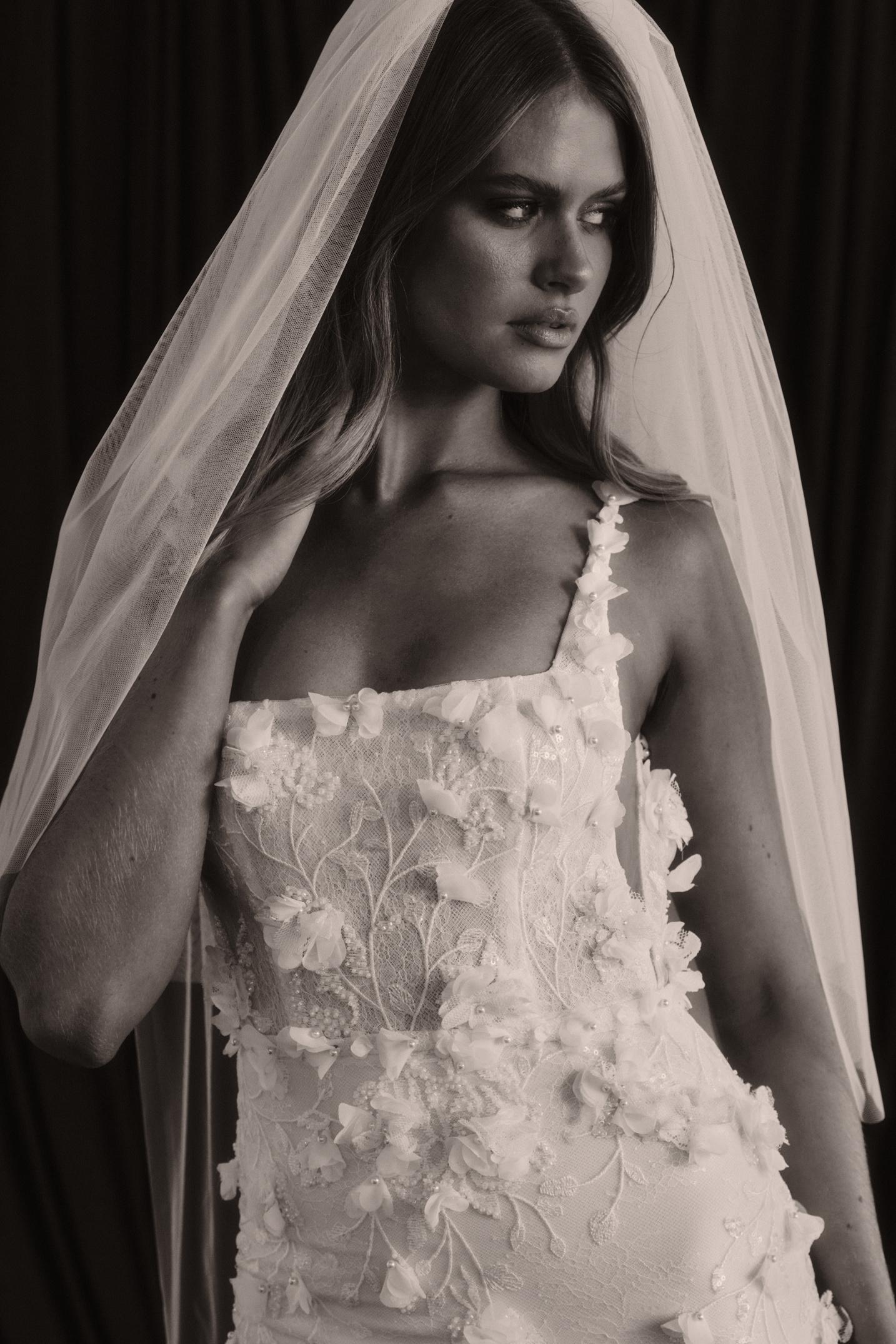 Perfect for a romantic celebration, Aire combines classic elements with contemporary style for a truly unforgettable bridal look. Pair Aire with our soft ivory tulle accessories to further accentuate her delicate beauty.