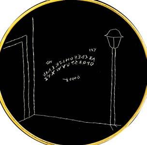 VISUAL DESCRIPTION: Black fabric in an embroidery hoop depicting a room stitched in white thread. On the left there is an empty doorway, and on the right there is the outline of a lamp post. In the center there is a mirrored Ouija board in scratchy lettering, and the word “Goodbye” is incomplete.