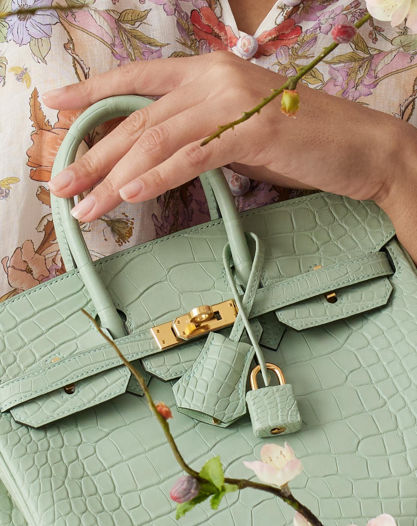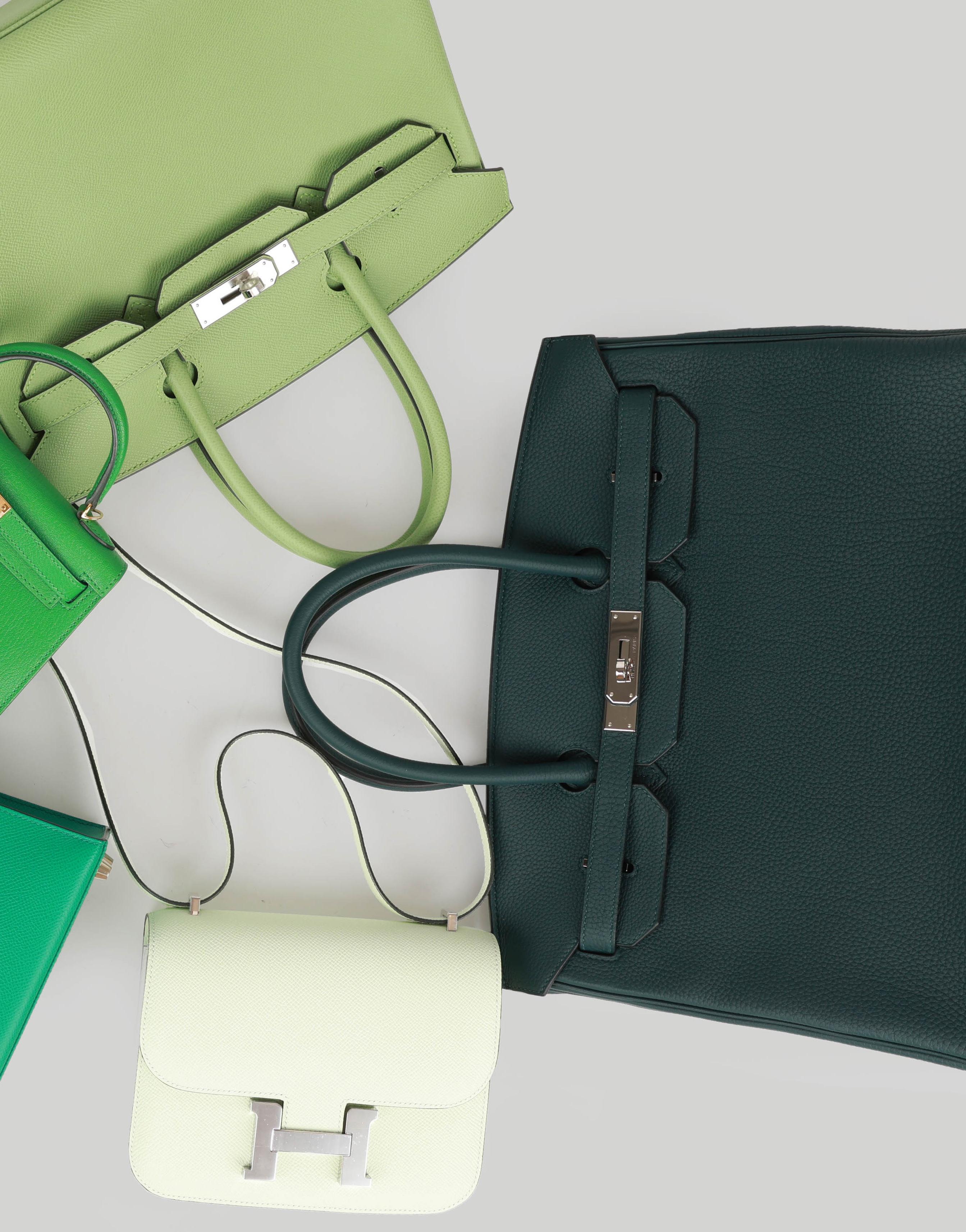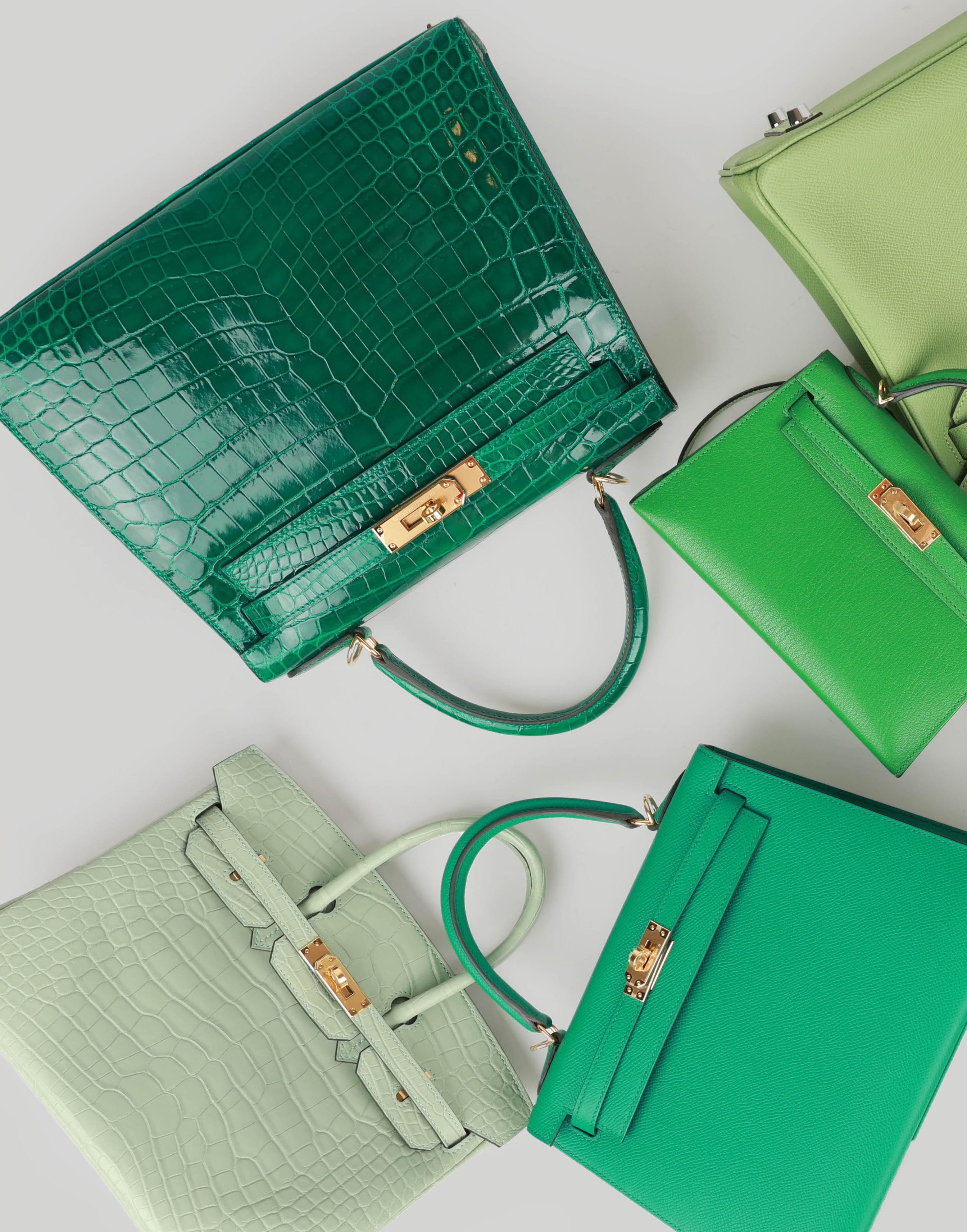 Pictured here are the Hermès Birkin 25 Vert D’Eau Matte Alligator Gold Hardware, Hermès Kelly Sellier 28 Vert Jade Epsom Gold Hardware, Hermès Birkin 30 Vert Criquet Epsom Palladium Hardware, Hermès Constance 1-18 Vert Fizz Epsom Palladium Hardware, Hermès Birkin 30 Vert Fonce Togo Palladium Hardware, the Hermès Kelly Sellier 20 Bambou Chevre Gold Hardwear and the Hermès Kelly Sellier 28 Emerald Shiny Crocodile Gold Hardware