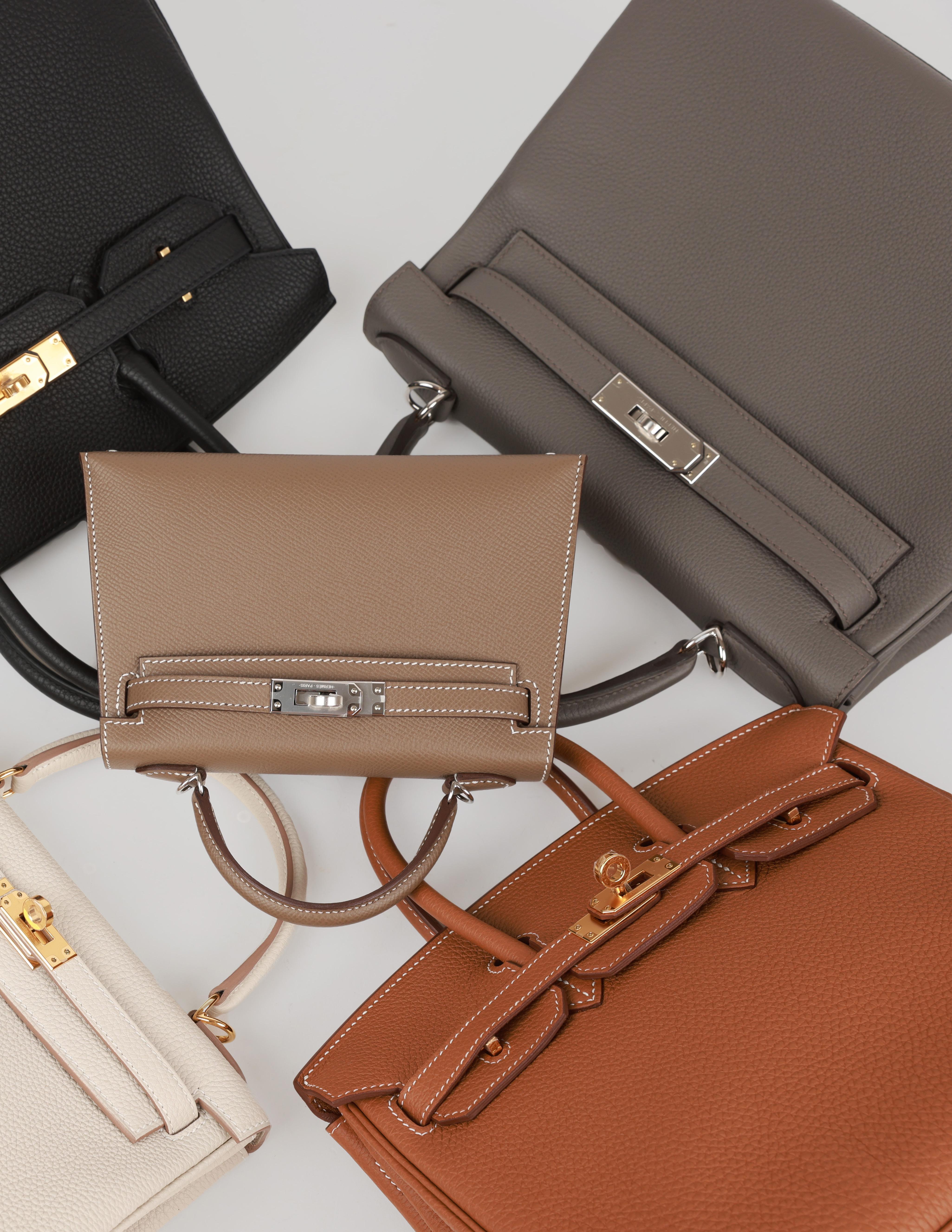 Pictured here are the Hermès Kelly Retourne 25 Etain Togo