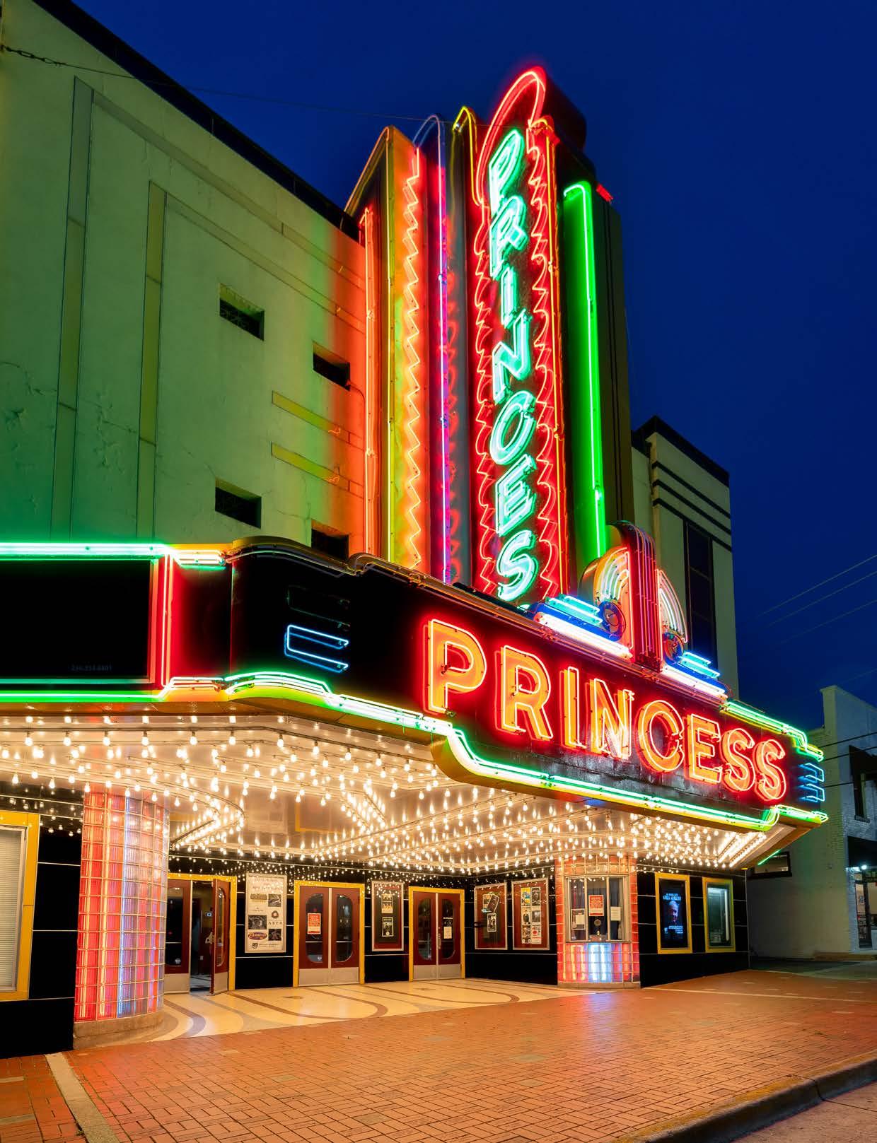 Fast forward two decades and in 1941, the theater once again moved with the times, this time receiving a Cinderellalike makeover. This era brought about the iconic art deco facade with a neon marquee sign that the Princess is known for today. Inside, the theater was decked out with murals that glow under black light, fluorescent carpeting, and a map of the state of Alabama with a special marking for Decatur on the terrazzo tile floor of the lobby. The ingenious and aesthetic touches were the work of local architect Albert Frahn and continue to captivate visitors to the Princess today. The new Princess Theatre was presented to the public on August 7, 1941 with a showing of “Tom, Dick, and Harry” featuring Ginger Rogers.