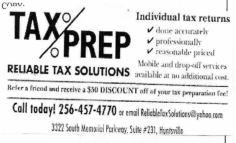 Over 4,000 cars tosearchonline Tofindyournextride,goto O 4 000 TM17691 Madison CountyRecord Classified FindHundredsofNorthAlabamaClassi edAdsSearchableatTNValleyStuff.com MADISONCOUNTYAND SURROUNDINGAREAS 7734MadisonBlvdSuite115 Huntsville,AL35806 256-260-2226 MadisonCountyRecordisthepublicationforLegal/PublicNoticesinMadisonCounty.TheyarepublishedinMadisonRecordasacourtesytoourreaders. TheMadisonRecord.com classifieds@madisoncountyrecord.com legals@madisoncountyrecord.com TM17689 May22,2024 THERECORD •1C SUDOKU SUDOKUANSWERS Announcements SpecialNotices HuntsvilleHospital HealthSystem isnowaccepting proposalsforthe expansionofNorth Alabamatelemedicine servicesinconnection withthedistributionof CoronavirusStateFiscal RecoveryFunds. Pleaseseethe RequestforProposalat: https:hh.health/ procurement-opportunities/ Employment DriversWanted Non-CDL Truck Driver TheTimesDailyhasaposition availableforaNon-CDLTruckDriver. TheidealcandidatemusthaveanexcellentdrivingrecordandacleanMVR (motorvehiclereport)aswellasproofof personalautoinsurance. CandidatemustpassaDOTphysical,be abletoliftupto50pounds,andbecapableofdrivingupto8hoursatatime. Mustbeabletoworkflexibleschedules includingdays,nights,weekends,and holidaysasneeded. Pleaseemailresumesto hollie.colella@timesdaily.comorapplicationsmaybepickedupat 219WestTennesseeSt. Florence,AL35630 Merchandise EstateSales DECATURESTATESALE 3720S.WoodtrailRd.SW May23,24,25 Thurs.8-5,Fri.8-5,&Sat.8-2 PB&JESTATESALES Seephotosatestatesales.net *Privatedrive-watchforparkingmarkers! Garage&YardSales MADISON:YARDSALE687 CrestviewDr. June7th-9thFri. Sat.Sun.8-5Womens’clothes, shoes,boots,householditems, pictures,vintageglassware, traveldufflebags,andlarge storagebin injaywriting@gmail.com Farmer’sMarket VEGETABLEPLANTS:COLE CROPS, 30+varietiesoftomatoes,peppers,squash,cucumbers,melons,herbs,etc.Nothing over$1perplant. Closedon SundaysandMay9th, JoeP Gingerich,225DooleyRoad, Etheridge,TN38456. Furniture 3PCQUEENBEDROOM suiteOak2 dressers,nightstand$50PotatoOnionBin for$35Text256-483-3675 Miscellaneous 250GALLONWATERTANK, $100OBO, 256-366-6149Florence ALABAMA CRACKMAN “WilliamJamesGreenleeIII” ExtraMileBrick (ALLMASONRYREPAIR) •Fireplace•Chimney •Firebox •CrackedWalls•LooseBrick •DrivewayCracks•Steps •Firebox•TuckPointing •CrackedBrick•Stucco •StoneWork•Concrete •HistoricRestoration 82AIRBORNEINFANTRY CombatVeteran 256-797-5281 CATERGATER Camo20ozcoolerwith handle.LikeaYeti.$140Neverused.256263-7636 LeaveMessage CLOTHESLINEPOSTS, 3”insteel pipe,11/2”crosspiece,3stainlesssteel linesfromposttopost,$50.Call256-5653482Decatur IAMLOOKINGTORENT a2bdrm. houseorapartment.Hartselle256-6162092 PAIROFMEN’SADIDAS HighTops,red& white,size10,neverused,256-686-2377 or256-556-8204 VINTAGEPATTERNPFALTZGRAFFCHINA 87PCS.$300 obo256-685-2205or256-5771801TownCreek Jewelry&Watches HALOSTYLE ENGAGEMENTRING (Size5)withPrincesscutBlackDiamondcenterstone,1.3ctwith30-.01ct eachroundbrilliantcutdiamondsasaccent,Sl1Clarity,Gcolor,approx..34