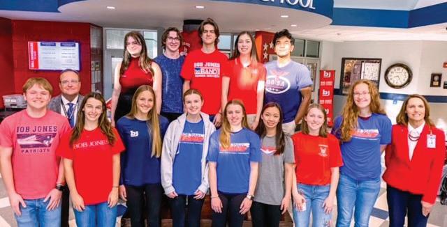 National Merit Finalists at Bob Jones High School are Andrew Crocker, front row from left, Madeline McInvale, Piper Larkin, Elizabeth Haddock, Taylor Turpin, Samantha Chan, Lucy Halter, Rachel Ehrman and Bob Jones Principal Sylvia Lambert. MCS Superintendent Dr. Ed Nichols, back row from left, Elizabeth Newsom, Luke Garrison, Francois Le Roux, Lauren Sheehy and Pranav Satheesh. Not pictured are Abram Carlson and Zoe Widman.