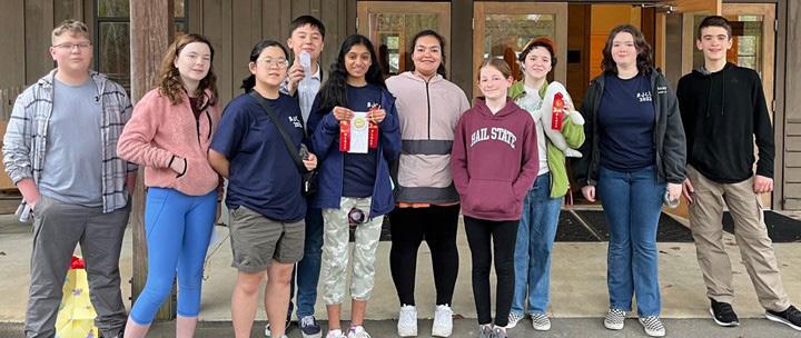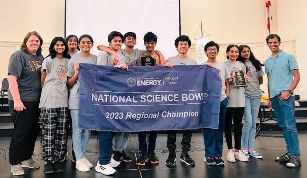 These teams from Liberty Middle School achieved high ranks in regional competition of the 2023 National Science Bowl. Dr. Lori Shrode, at left, serves as the teams’ teacher coach, and Suresh Avula, far right, is the parent coach.
