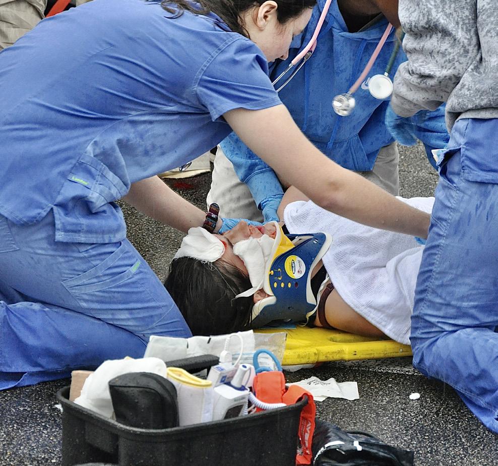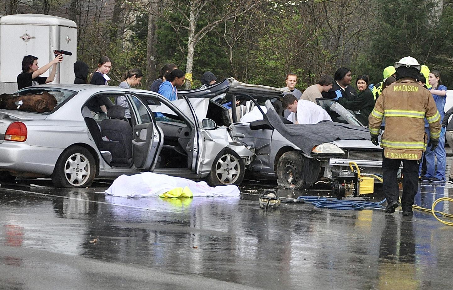 MOCK TRAUMA - Students at James Clemens High School joined HEMSI ambulance and Madison Police and Fire officers on Friday in a mock trauma with crashed vehicles and multiple accident victims. The exercise allowed JC students in the Health Sciences department to practice emergency first aid skills, including injury assessments, patient stabilization, retrieval from crushed vehicles and stretcher transfers to an awaiting ambulance. Theater students were staged as accident victims, complete with faux blood and wounds, and panicky loved ones traumatized by the gory accident scene. Students from the JetsPress media class captured the action as reporters. With prom season upon us, the scene served as a stark reminder of the dangers of distracted driving.