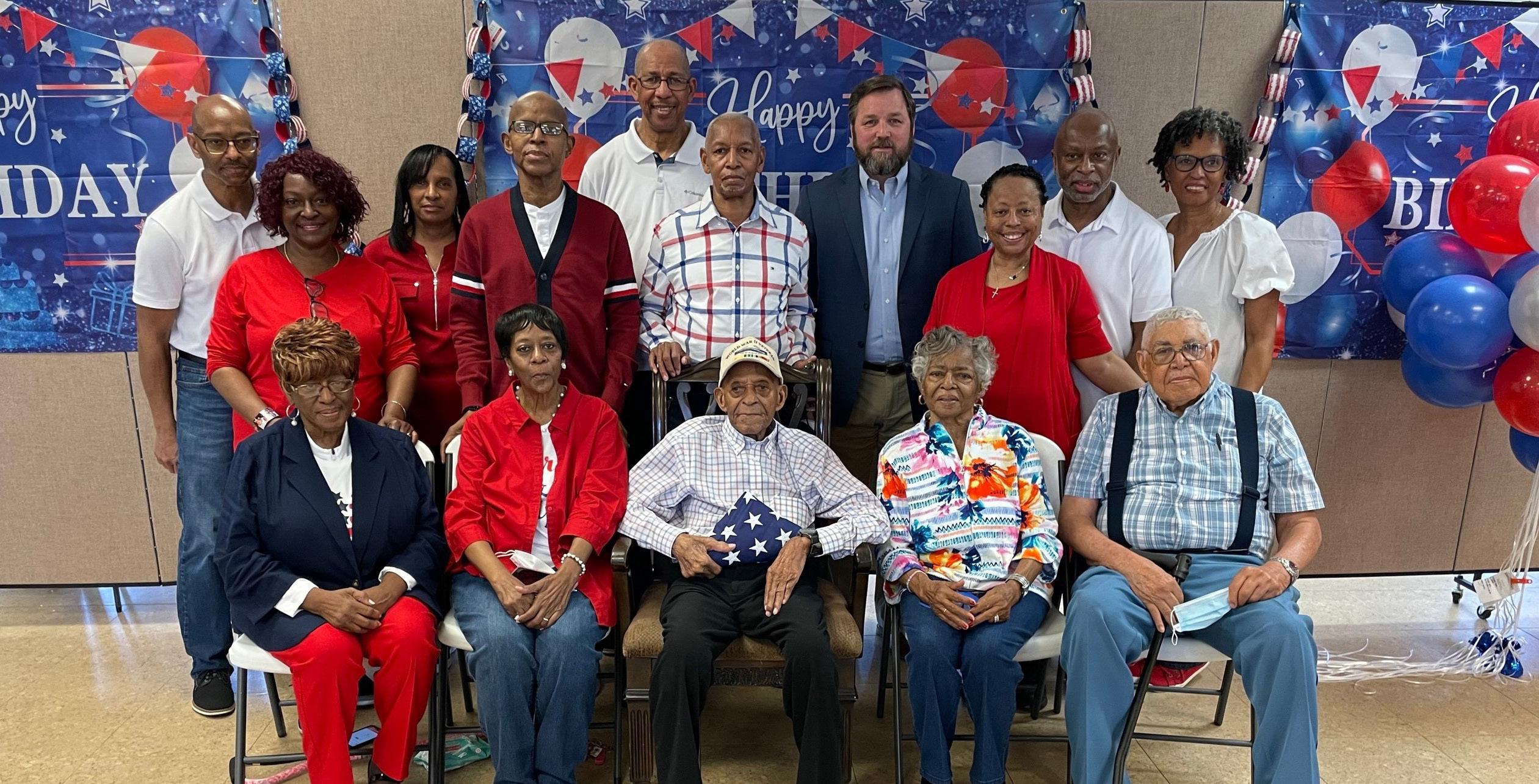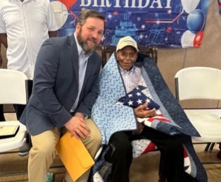 presented Mr. Drake with a Quilt of Valor. “You have positively impacted so many lives through your years of service and you continue to do so today,”Senator Tuberville noted in his letter to Mr. Drake. Mr. Drake served as an infantryman in the U.S. Army and is a lifelong Madison County resident. After his service in World War II, he returned home to Harvest, where he and his wife raised their nine children. Mr. Drake is pictured above with his children and Brian Naugher. He is holding the flag flown over the U.S. Capitol in honor of his 105th birthday.