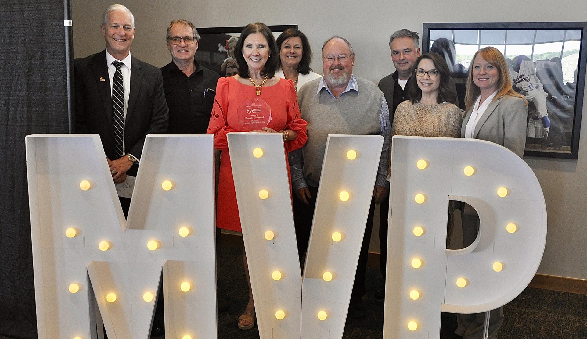 Madison volunteer Debbie Overcash, center, was presented the MVP’s first Visionary of the Year Award during a special ceremony at Toyota Field on Thursday. She is surrounded by her co-workers from Torch Technologies