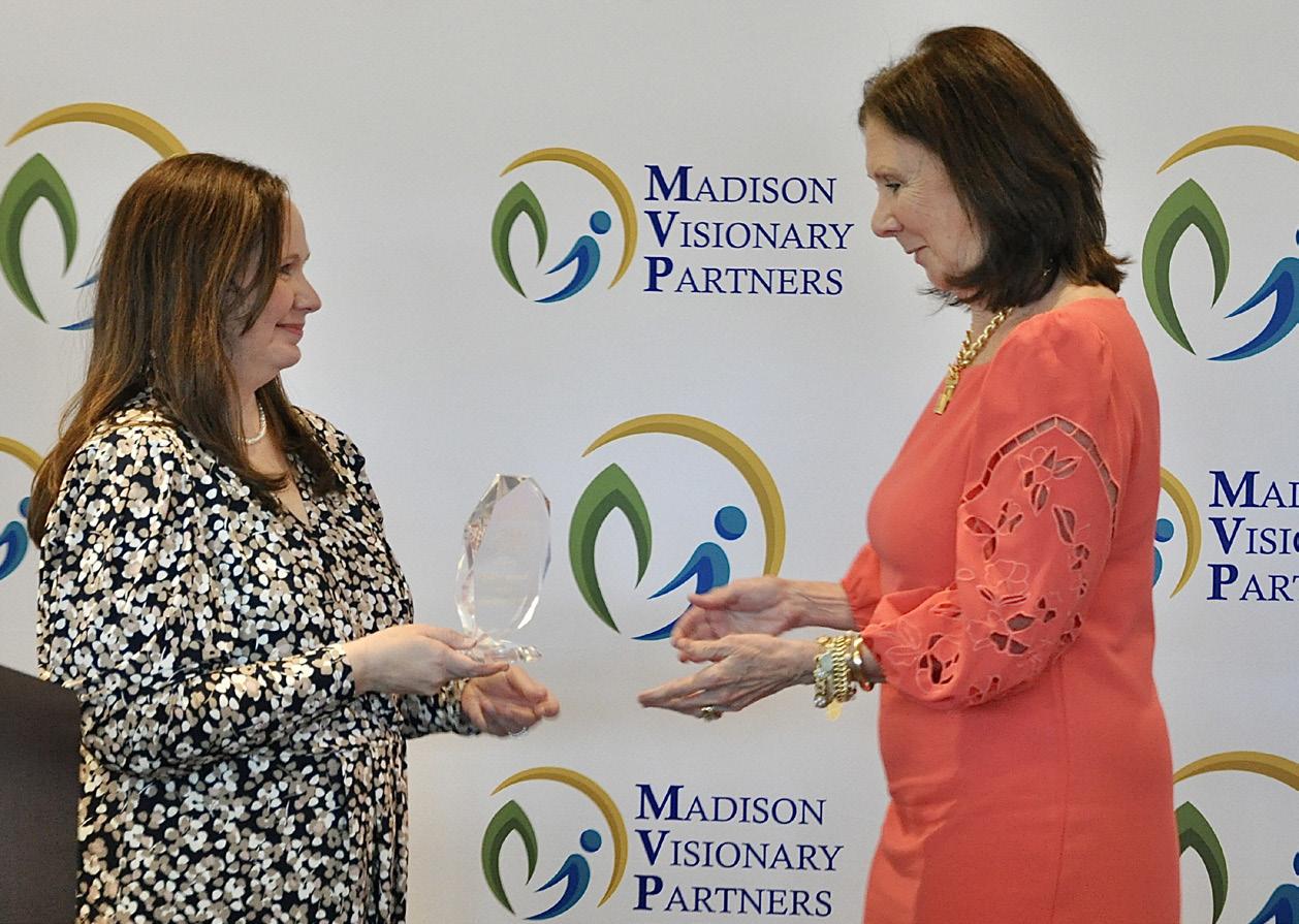 Debbie Overcash (right) was present the first Visionary of the Year Award from Madison Visionary Partners on Thursday. She was presented with the award by MVP Executive Director Melanie Thornton.