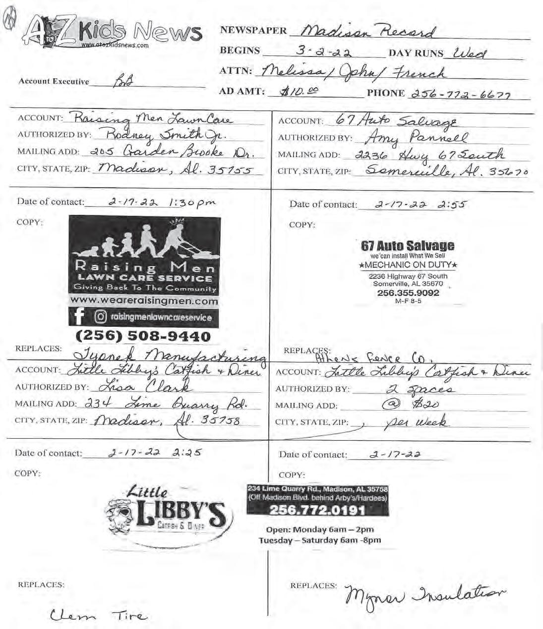 2A • THE MADISON RECORD May 24, 2023 540890-1 GENERAL INFORMATION 256-772-6677 To report news: 256-763-1150 news@themadisonrecord.com To place an ad: Display: 256-714-7152 Classified: 256-260-2226 Public Notice: 256-382-7490 French Salter General Manager 256-772-6677 french.salter@ theredstonerocket.com John Few Editor 256-763-1150 john@themadisonrecord.com Gregg L. Parker News Writer gregg@themadisonrecord.com Bob Labbe Sports Writer bob0873@yahoo.com Donna Counts Advertising Sales 256-714-7152 SUBSCRIPTIONS In county one year .............. $30.89 Mail rates for state residents One year ........................ $123.56 For questions about subscriptions, please call 256-772-6677. CORRECTIONS The Madison Record will be happy to correct any errors which appear in the newspaper or clarify any statements which are unclear. To request a correction or clarification, call 256-7631150 between 8 a.m.-5 p.m. Monday -Friday, or email news@ themadisonrecord.com. COMMENTS Have a comment about a story or a suggestion? Email news@ themadisonrecord.com 2ND CLASS POSTAGE PAID Madison Post Office Madison, AL 35758 (USPS 324-960) ISSN 0089-4250 POSTMASTER Please send address changes: P.O. Box 859, Madison, AL 35758 The Madison Record is published each Wednesday by Tennessee Valley Media, Inc. Madison THE RECORD The Madison County Record was established in 1967 Photos of the Week 544949-1 GETPEACEOF MINDABOUT YOURFAMILY’S WATERQUALITY. WHOLEHOMESYSTEMS|DRINKINGSYSTEMS|WATERHEATERS|SOFTENINGSYSTEMS&MORE WWW.IWANTGREATWATER.COM •ReducesWaterSpots &SoapScum •EnjoySofterSkin&Hair fortheWholeFamily •ExtendtheLifeofyour WaterHeaters&Appliances •EliminatetheHassleof PurchasingBottledWater •FoodandBeverages TasteBetter Ifyouareinterestedincutting downonthecostoffiltered waterbyhavinganinstalled waterdrinkingsystem,our experiencedteamcanassistyou. CALLTODAY! 256-645-9303 AMERICANMADE FREE WHOLEHOME WATER SOFTENERS STARTINGAT $1,699 INSTALLED DRINKING WATER SYSTEMS STARTINGAT