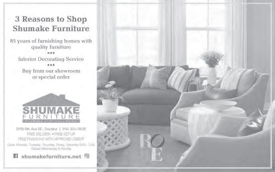 May 24, 2023 THE MADISON RECORD • 5A 544910-1 ALCert #05007 JoeEast 540888-1 OneHourHuntsville.com Familyownedandoperatedsince1969 CALLTODAY! 256-851-6510 $ 59 $ 100Off SPR ING TUNE-UP for 1st time customers on any repair over $1,000 OFFERS GOOD THROUGH MAY 31 2023 ★★★★★ JoeEastandcompany wereonpointandontime. WeneededanewAC unitandtheydelivered.I wouldrecommendthem handsdownforallyour HVACneeds.Theyhavea customerforlife!Don’tthink twice,givethemacallnow! --ChrisC. VOTED2021BESTHEATINGANDAIRCOMPANY! 203SouthMainAve,Fayetteville,TN•931-433-2582or877-293-2582 FREE DELIVERY! www.Norman-Furniture.com 544940-1 ask aboutOur In-Home Design Team! ShopOur memorial day sale GoingonNow! UPTO 40%OFF ALREADYLOW PRICEOF IN-STOCKITEMS 542304-1 Alabama Jubilee 46th Annual Artist and crafts for sell: Food, freeze dried treats, honey, pottery, toys, jewelry, baby & children’s clothes, birdhouses, wood crafts, ironworks, fudge, unique jellies, caricatures, purses, candles, needlework, gourds, baskets, face painting, soap, hats, belts, knives, photography, puppets, blown egg art, and much more! Other activities include antique cars, tractors and motorcycles, hot air balloons, aquatic center and entertainment. May 27th & 28th 2023 Saturday • 7 am to 6 pm Sunday • 9 am to 6 pm Point Mallard Ice Rink Pavilion Decatur, Alabama Arts & Crafts Show Sponsored by Decatur Art Guild and Athens Optimist Club Proceeds go to Morgan County Schools Art Department LUNCH&DINNER/SUNDAYBRUNCH 619MERIDIANST | 256-539-8001 | FurnitureFactoryBarGrill.com ANDINPROVIDENCE:7TownCenterDr.,Ste103 MondaySTEAKNIGHT TuesdayKARAOKE WednesdayCORNHOLETOURNAMENT ThursdayBIKENIGHT MondaySTEAKNIGHT 541589-1 INHUNTSVILLE INPROVIDENCE 5/25-BRANDONELDERBAND 5/26-CONTAGAN(ROCKNROLL) 5/27-HASHBROWN 5/24-SILVADEAN5/26-FULLCIRCLE 5/25-KARAOKE5/27-GROOVE Check out this week’s news and sports stories at www.themadisonrecord.com Snapshot Here