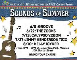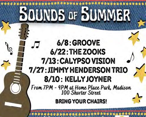 starts Monday Concerts in the Park takes place every Monday through the summer in Big Spring Park. For more events, go to themadisonrecord.com LUNCH&DINNER/SUNDAYBRUNCH 619MERIDIANST | 256-539-8001 | FurnitureFactoryBarGrill.com ANDINPROVIDENCE:7TownCenterDr.,Ste103 MondaySTEAKNIGHT TuesdayKARAOKE WednesdayCORNHOLETOURNAMENT ThursdayBIKENIGHT MondaySTEAKNIGHT 541589-1 INHUNTSVILLE INPROVIDENCE 5/31-TBD6/2-TBD 6/1-KARAOKE6/3-FULLCIRCLE 6/1-BikeNightMIKEHONEA 6/2-SPACEDONKEY 6/3-ERICRHODESBAND