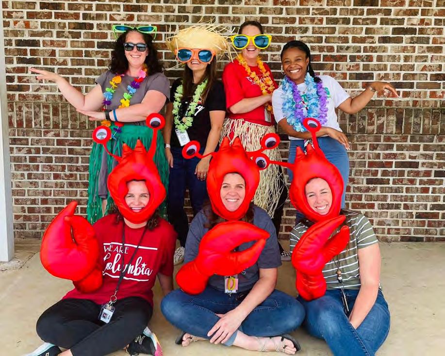 SCHOOL’S OUT OR SUMMER! - This cheerful group of happy crustaceans and hula dancers make up the famous “Columbia Carline Crew”. Last Wednesday afternoon, this was their way of saying “aloha” to the end of the school year and wishing students a wonderful summer. Schools in Madison are now out for the summer break, except for summer school and the various camps hosted on school campuses. Students will return for the fall semester on Aug. 3. Pictured above: (first row - left to right) Karen Jump, Megan Hockey, Alisha Mayfield, (second row) Alisha Courtney, Nancy Conrad, Molly Hayne and Ashley Mitchell-Dowdell.