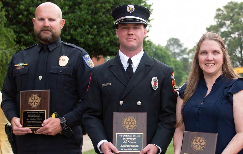 Overcash is a Rotarian and chairs the award program. During Monday’s Madison City Council meeting, she presented city employee Michelle Dunson, MPD Sergeant Michael Dixon and firefighter Cole Edwards with plaques for being named Madison’s Employee of the Year.