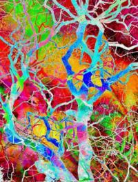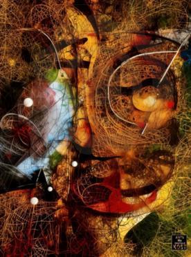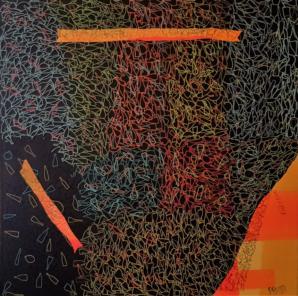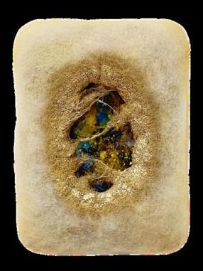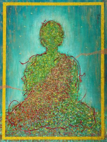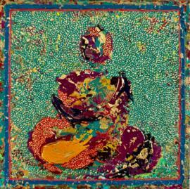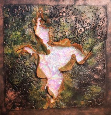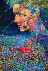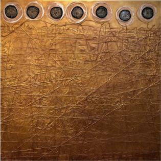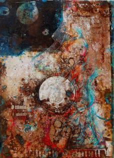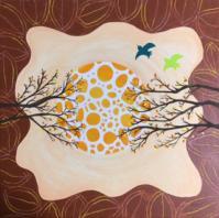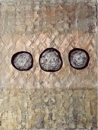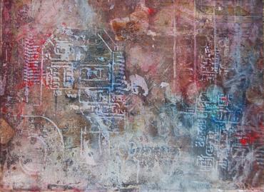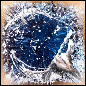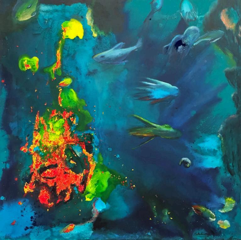 LIFE series: Trained in the Japanese traditional painting style known as Nihonga, which employs sumi ink, delicate brushwork, and natural mineral pigments, her artistic practice is rooted in reverence for the past, yet directed toward the future Her goal is twofold: to revive the dynamism, boldness, and often playful spirit seen in the works of masters like Hokusai Katsushika and Jakuchu Ito, and to pioneer a new visual language that fuses classical materials with contemporary and technological motifs, including computer circuit boards, acrylic pouring, and silkscreen printing At the heart of this exploration is her ongoing LIFE series, a body of abstract works that oscillate between the microcosmic and the macrocosmic Motifs emerge from both organic and synthetic sources: microscopic images, ancient scripts (Chinese, Sanskrit), digital circuitry, or purely imagined forms The series blurs boundaries between biological and mechanical, ancient and futuristic, material and immaterial