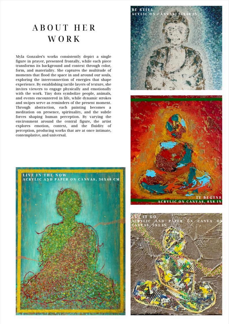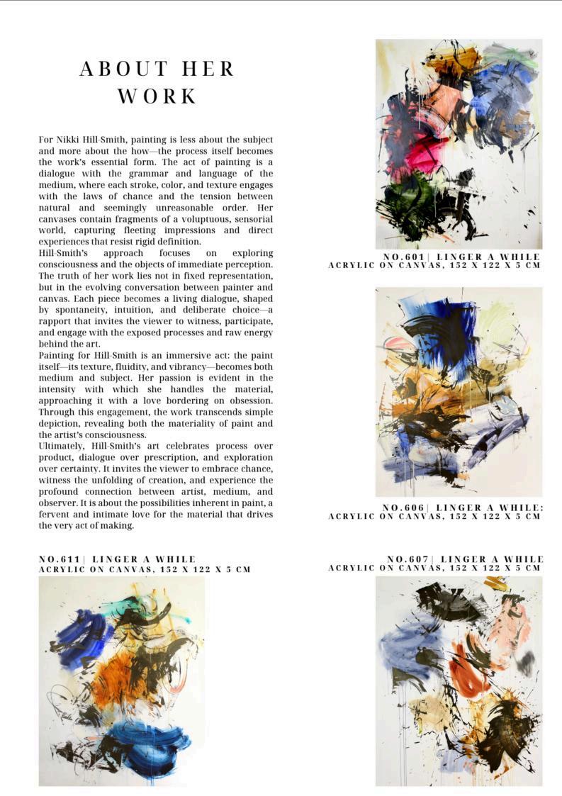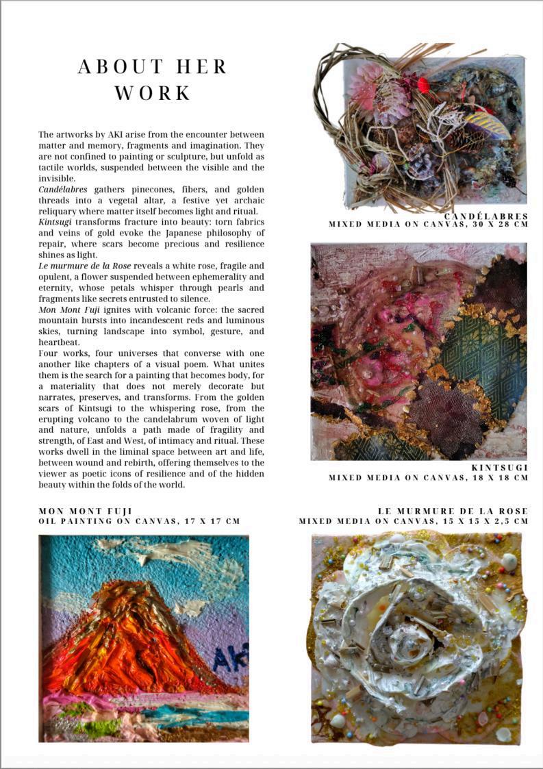Kurinoki’sartbecomesmeditation:seeingtransformsintofeeling, and every brushstroke becomes an intimate dialogue between nature, spirit, and observer The layering of canvases, the interaction of line and color, and the delicate marks along edges and surfaces reinforce the sense that her art is not only to be looked at but to be inhabited, experienced, and cherished. Through her work, Tomomi Kurinoki leads us toward a vision of the world in which every flower, every line, every nuance is a manifestationofthedelicateandprofoundbeautyoflife,acallto perceivetheinvisible,tohonorwhatisephemeral,andtodiscover ineveryformasmall,silentmiracle