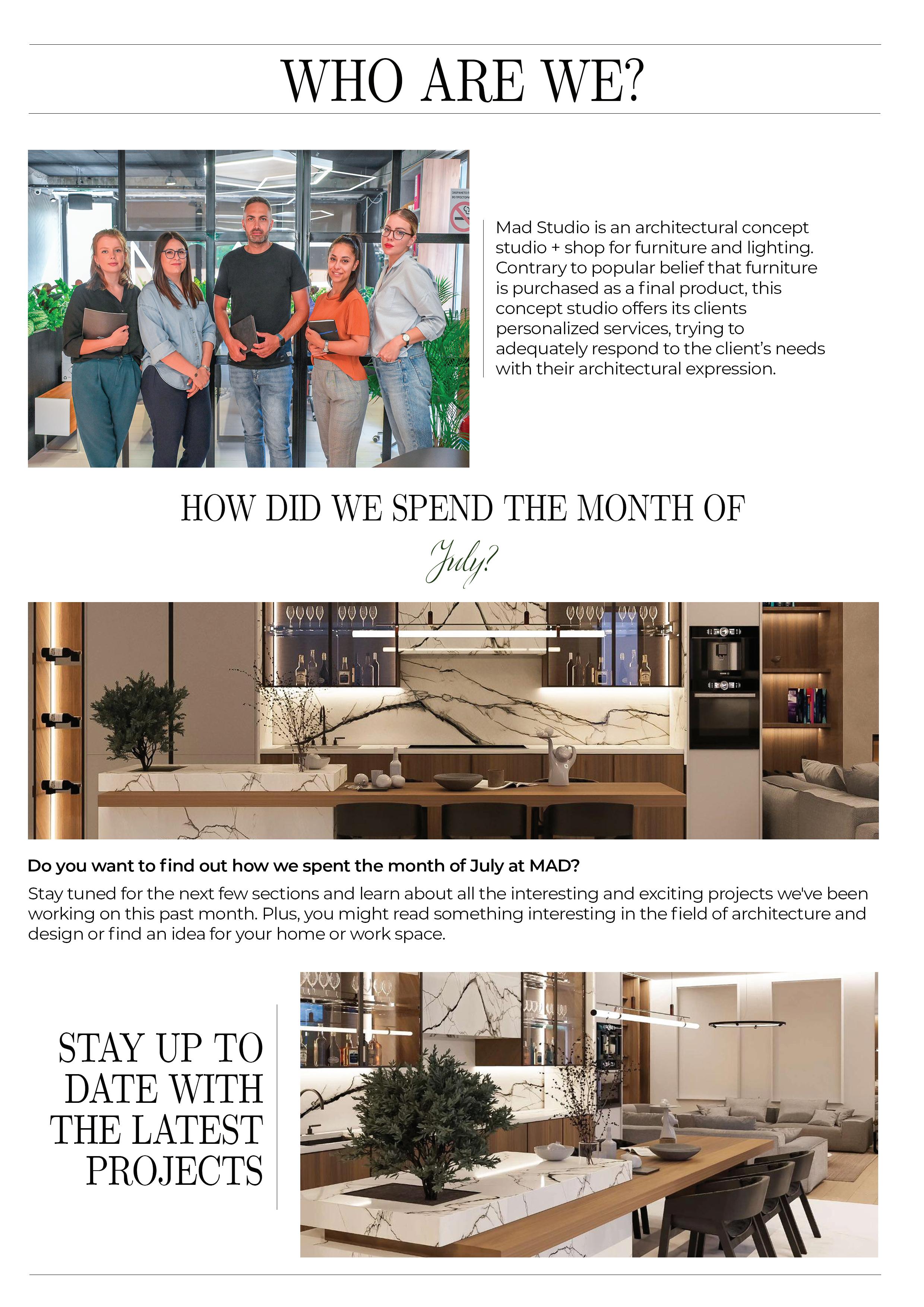 Take a look at our monthly brochure where you will get to know all the interesting and exciting projects we worked on in the month of July. Plus, you might read something interesting and exciting from the world of architecture and design, or you might find an idea for your home or workspace.