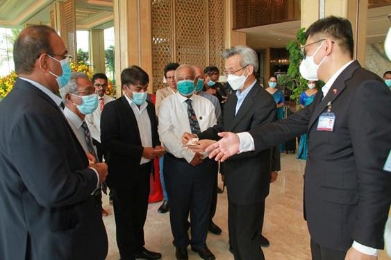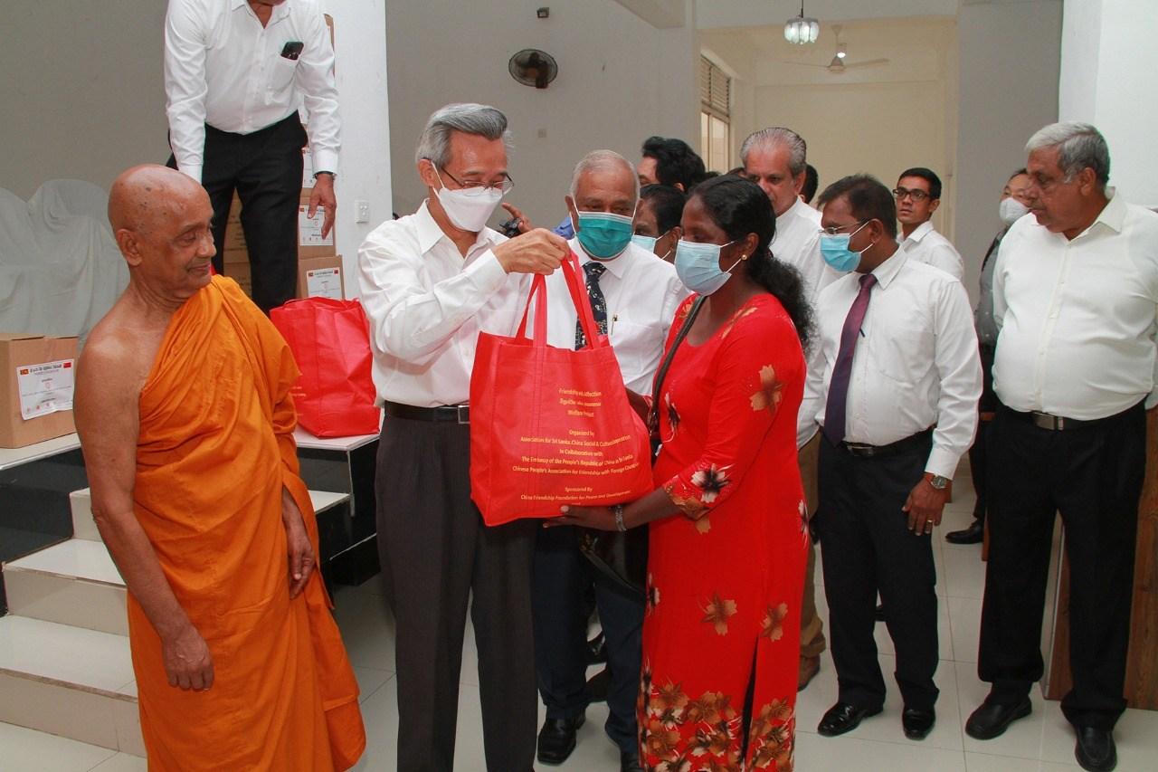President Lin Songtian of the CPAFFC offered flowers to the statue of Faxian Thero (who came from China to Sri Lanka to study Buddhism 1,600 years ago) in the Ode Temple, and distributed dry rations boxes to 150 underprivileged families from all communities nearby.