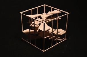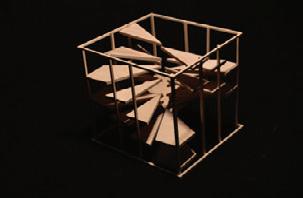 For the tectonic portion, ideas of spiral, ascension, and confinement within the same frame of the new object. The idea of the spiral staircase is a key portion that is aimed with the tectonic object, maintaining the core aspects of the stereotomic box. In order to hold both spiral motions soundly, rods are attached to the end of each dowel, allowing freedom of shape and motion with each geometric shape. In the stereotomic object, the spiral is confined with rectangular prisms on each side of movement. To the contrary of the stereotomic, the confinement of continuation is allowed to be continued and the movement upward is assumed through the openness of the object. In comparison to a DNA strand, the tectonics allows the movement up and around, less restrictions to the airy movement allowed.