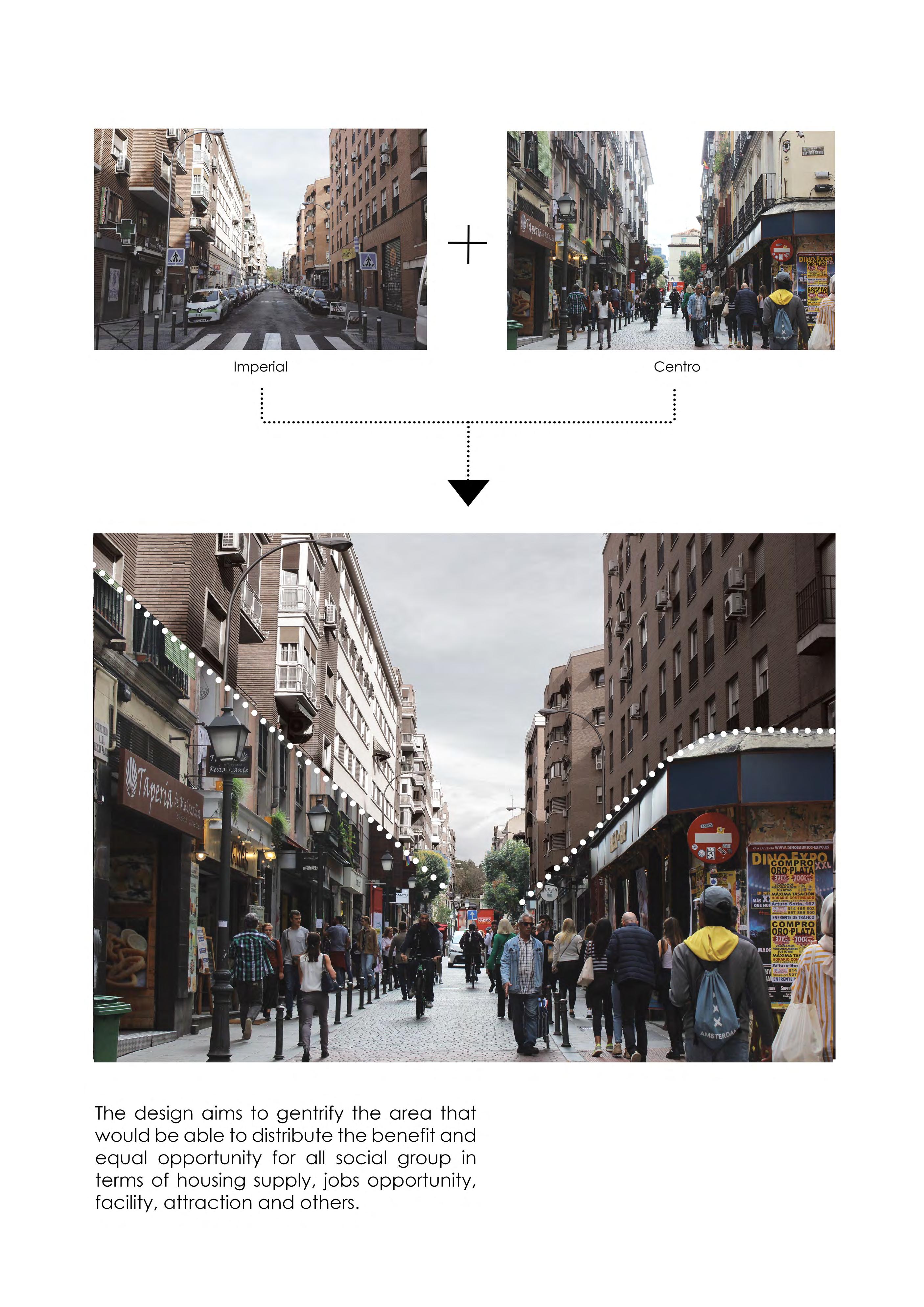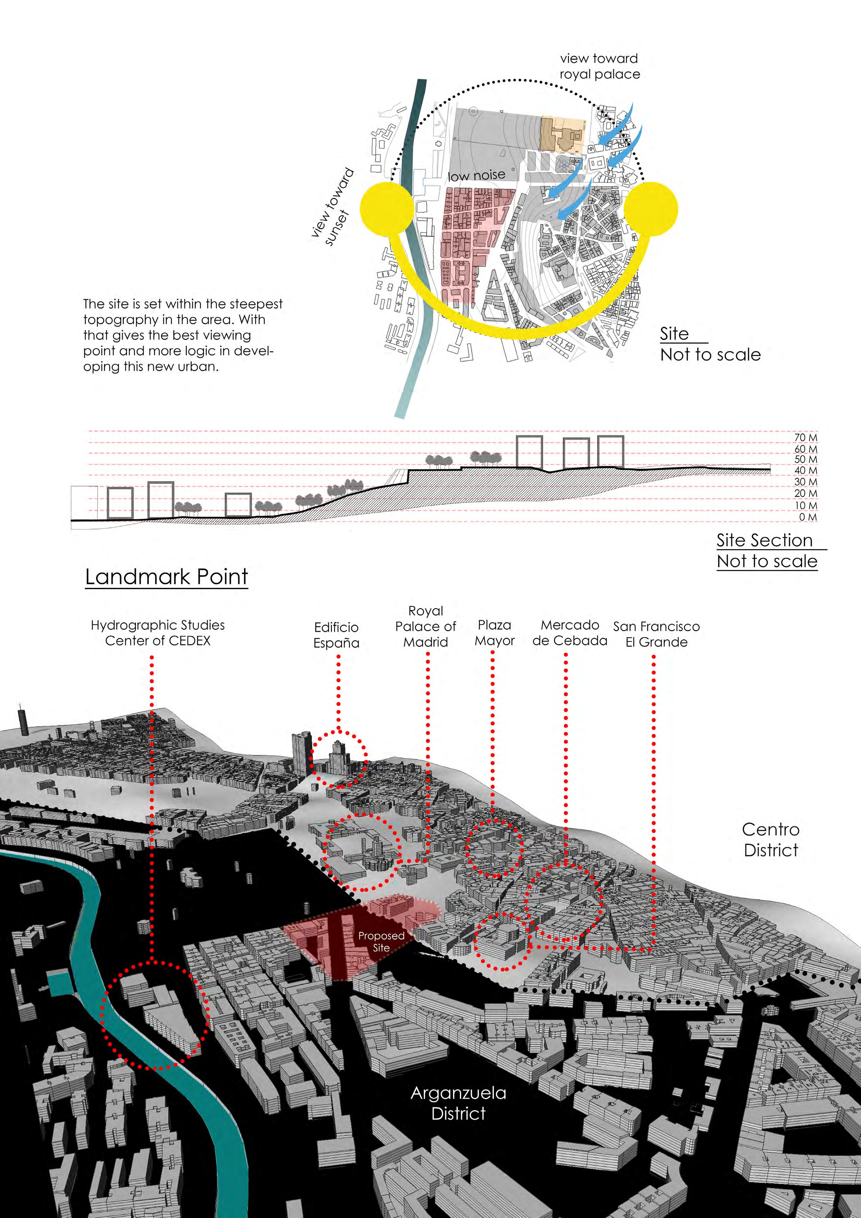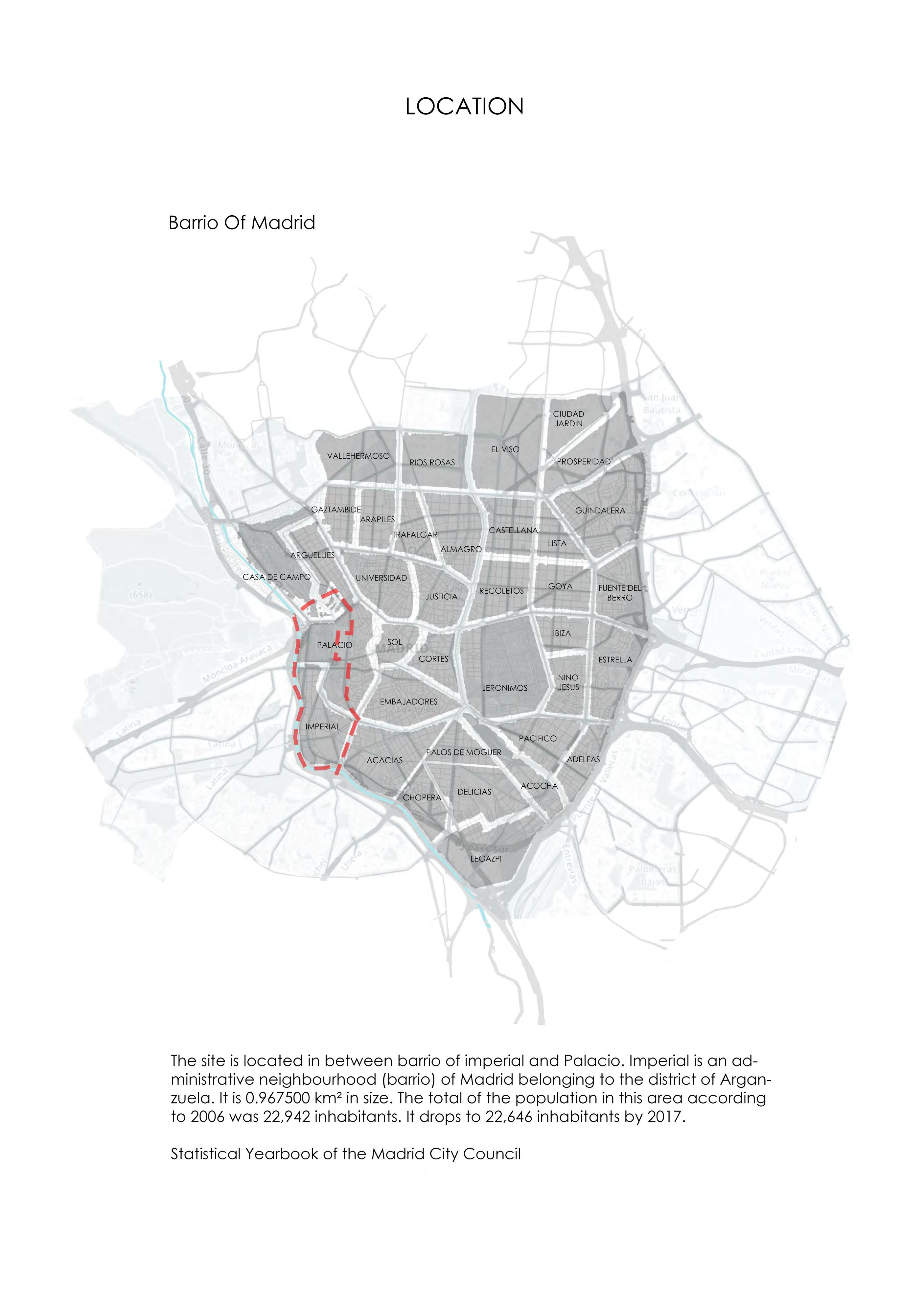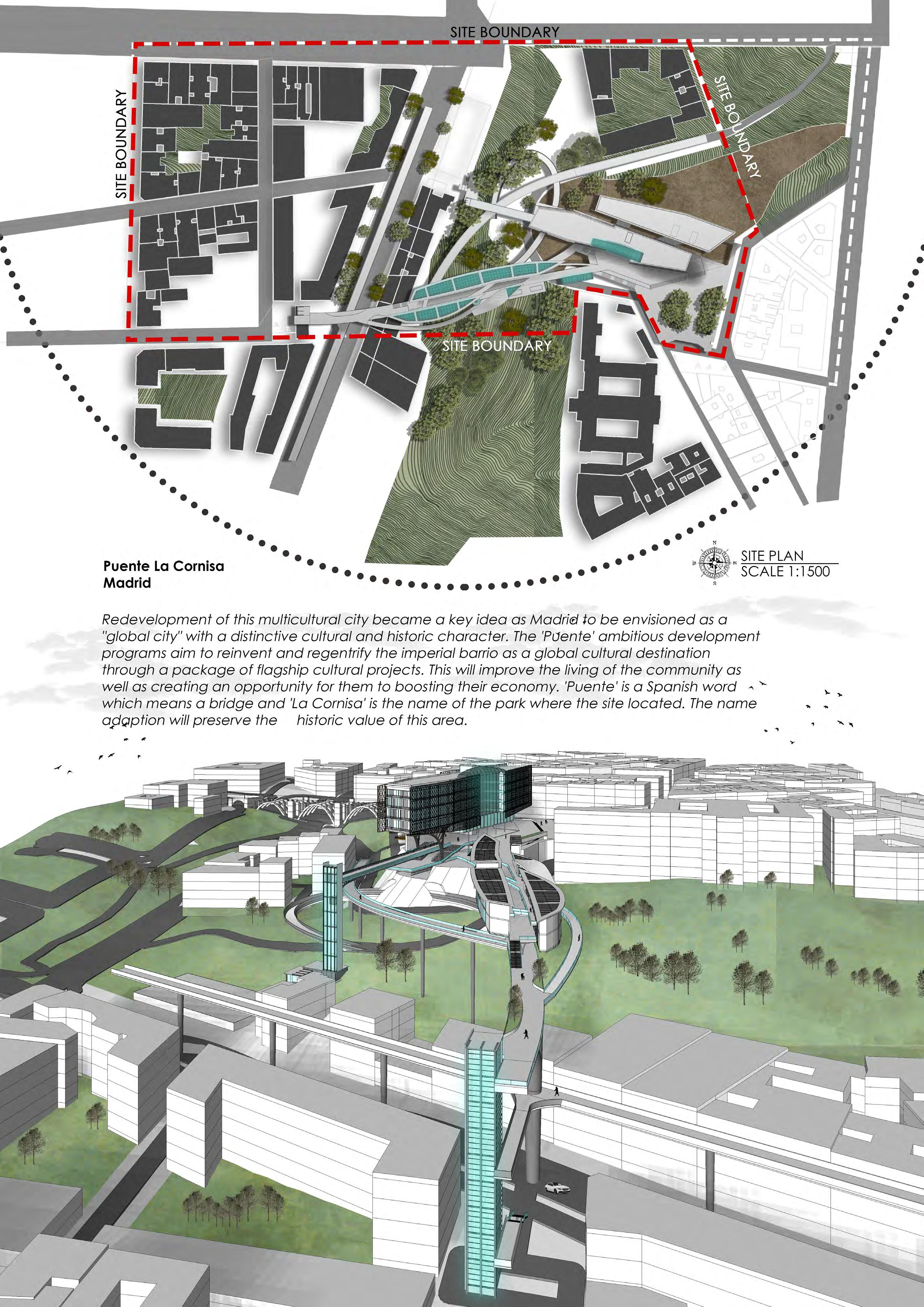 Redevelopment of this multicultural city became a key idea as Madrid to be envisioned as a "global city" with a distinctive cultural and historic character. The 'Puente' ambitious development programs aim to reinvent and regentrify the imperial barrio as a global cultural destination through a package of flagship cultural projects. This will improve the living of the community as well as creating an opportunity for them to boosting their economy. 'Puente' is a Spanish word which means a bridge and 'La Cornisa' is the name of the park where the site located. The name adaption will preserve the historic value of this area.