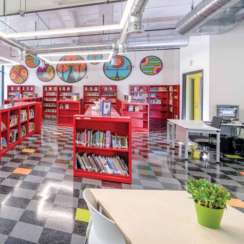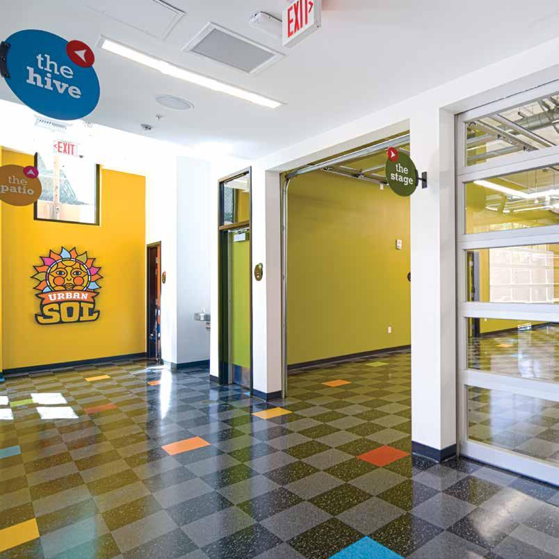 Visual Asylum has been integrally involved with the development of the brand identity for the school. The scope of work began with the creation of a unique brand identity system that equipped the school to generate the support and momentum needed to attract teachers, parents and donors needed to successfully launch a new charter school. This scope included interior design, murals, signage, banners, wayfinding, donor recognition sytem and design, naming common rooms; The Hive (lunch/multi-purpose), The Stack (library), The Studio (art room), The Stage (performing arts space), exterior signage as well as FF&E specification.