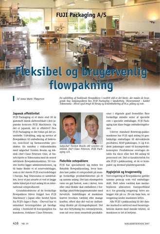 Japansk effektivitet FUJI Packaging er et mere end 30 år gammelt dansk datterselskab i den japanske koncern FUJI Machinery. Og det er japansk, det er effektivt! Hos FUJI Packaging er der fokus på det essentielle: Udvikling, salg og service af flowpakkere til emballering af fødevarer, non-food og farmaceutiske produkter. En rundtur i virksomheden med salgschef Torsten Brocks og teknisk chef Claus Petersen viser, at husets hjerte er Teknorama med de senest udviklede flowpakkemaskiner. Til venstre herfor ligger administrationen, og til højre finder vi et reservedelslager, som er det største FUJI reservedelslager i Europa. Bag Teknorama er samlehallen, hvor et par ansatte er ved at lægge sidste hånd på et nyt anlæg til en international osteproducent. Grundmodulerne af de forskellige flowpakkere bliver bygget hos FUJI Machinery i Japan eller hentet hjem fra FUJI’s lager i Paris. - Derved har vi mindsket leveringstiden på færdige anlæg i henhold til forespørgslen fra kunderne, forklarer Claus Petersen.