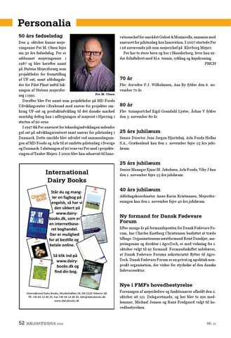 Personalia 50 års fødselsdag Den 4. oktober kunne mejeriingeniør Per M. Olsen fejre sin 50 års fødselsdag. Per er uddannet mejeringeniør i 1987 og blev herefter ansat på Statens Mejeriforsøg som projektleder for fremstilling af UF-ost, samt afdelingsleder for Pilot Plant indtil lukningen af Statens mejeriforPer M. Olsen søg i 1991. Derefter blev Per ansat som projektleder på MD Foods Udviklingcenter i Brabrand med ansvar for projekter omkring UF-ost og produktudvikling til det danske marked samtidig deltog han i udbygningen af mejeriet i Hjørring i starten af 90-erne. I 1997 fik Per ansvaret for teknologiudviklingen indenfor gul ost på udviklingscenteret samt ansvar for pilotanlæg i Danmark. Dette område blev udvidet ved sammenlægningen af MD Foods og Arla til at omfatte pilotanlæg i Sverige og Danmark. I slutningen af 90’erne var Per med i projekteringen af Taulov Mejeri. I 2000 blev han udnævnt til Inno-