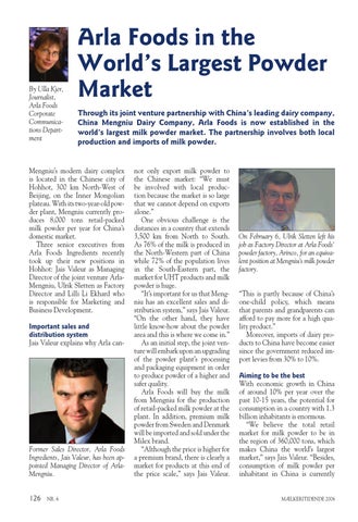 Arla Foods in the World’s Largest Powder Market Through its joint venture partnership with China’s leading dairy company, China Mengniu Dairy Company, Arla Foods is now established in the world’s largest milk powder market. The partnership involves both local production and imports of milk powder.