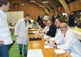 Kittelfolk og dommere arbejdede hårdt for at nå bedømmelser og karaktergivning af de mange hundrede produkter fra mejerierne, som indgik i produktudstillingen, der åbnede for deltagerne kl. 16.