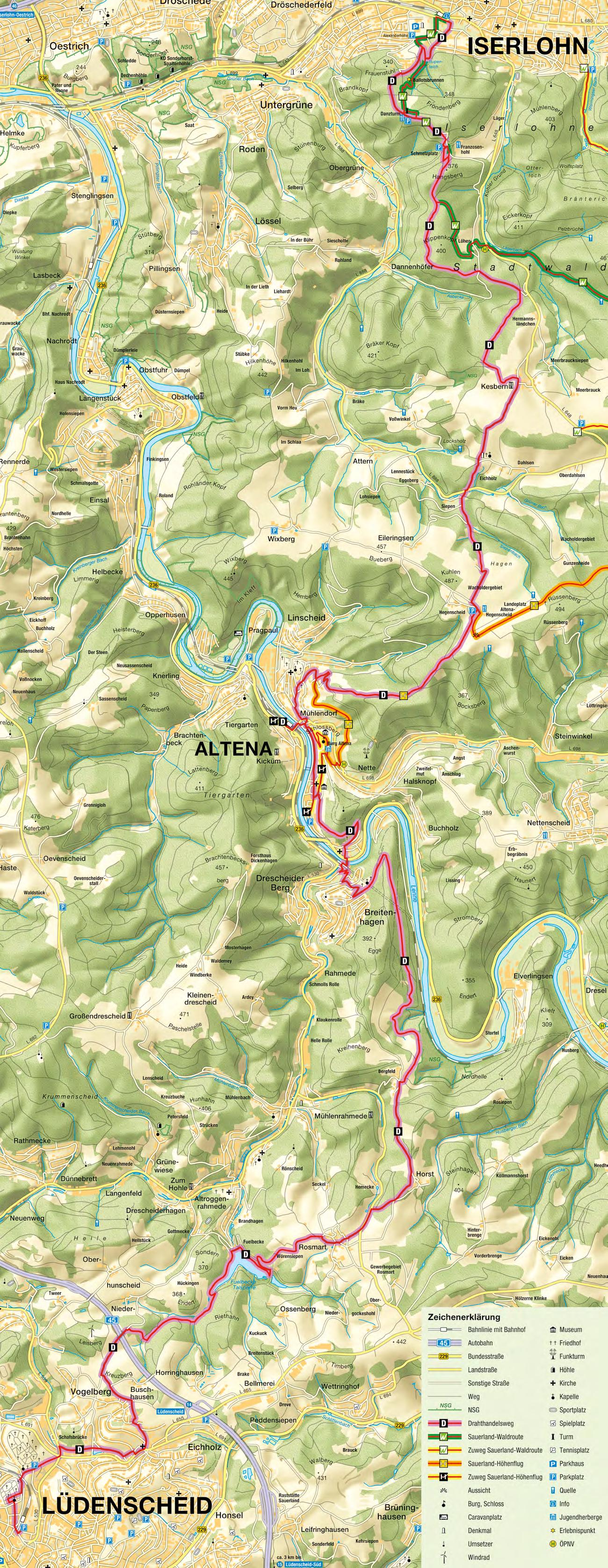 Die Route ist mit einem weißen auf schwarzem Grund gekennzeichnet. Unterwegs geben Hinweisschilder Auskunft über den alten Transportweg für Draht sowie seine Vor- und Endprodukte in vorindustrieller Zeit. Höhepunkte an der Strecke sind die Lüdenscheider Altstadt, Burg Altena, das Deutsche Drahtmuseum in Altena und der Danzturm in Iserlohn. In Lüdenscheid empfiehlt sich außerdem