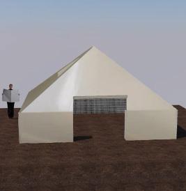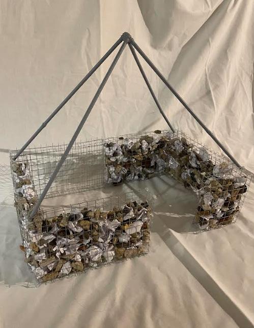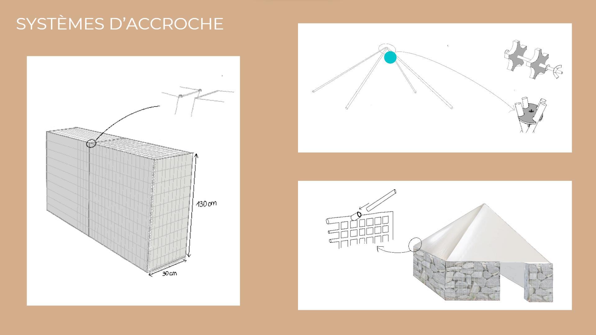 Ici j’ai décider de créer une boucle en réutilisant les débrits des habitations après le sésime afin de remplir des gabions en métals qui seront recouvert du bache imperméable posée sur un système de tiges.