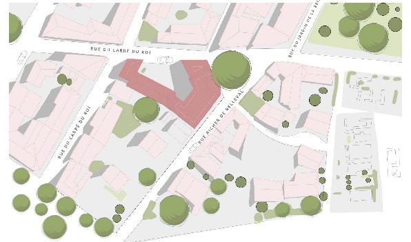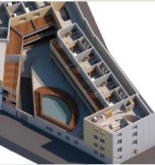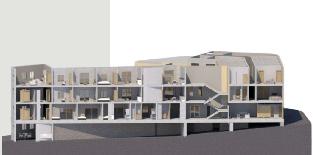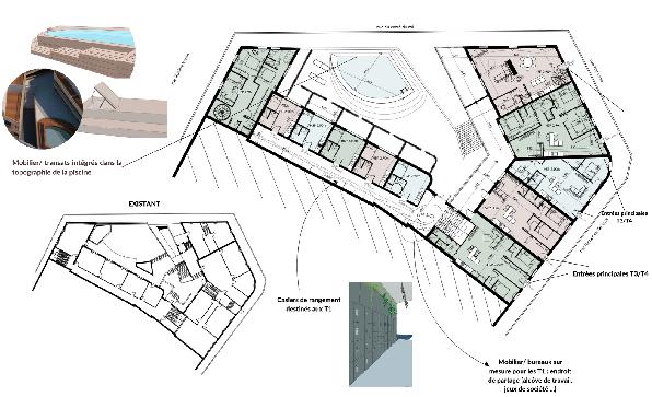 L’idée principale a été de regrouper les différents modes de vie associés aux tailles des logements (les T1 au même endroit afin de ne pas déranger les familles par exemple). Ensuite nous avons veillé à offrir une entrée indépendante à tout les plus gros logements (T3/T4) afin de retrouver un esprit «maison de ville». Les espaces communs sont partagés entre une grande terrasse avec piscine accessible seulement aux résidents et des salles de squash pouvant être frequentée par les locataires ainsi que tous les utilisateurs du quartier.