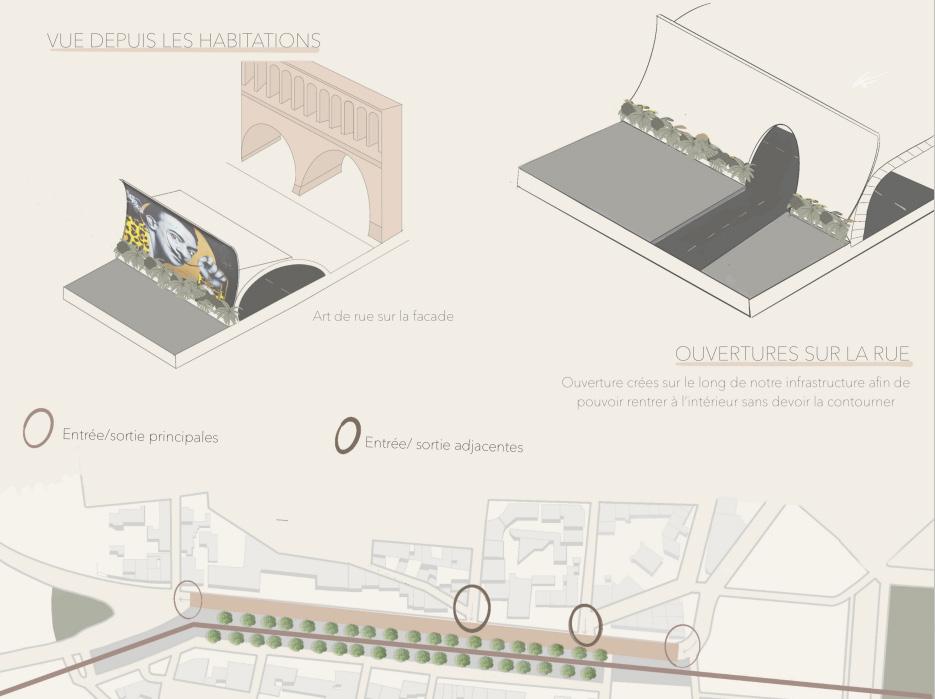 L’objectif de ce projet était d’imaginer une installation urbaine utile et propre au quartier des arceaux à Montpellier. Après l’analyse des contraintes et des besoins sur les lieux j’ai ressenti un manque de sécurité ainsi que l’oubli du carctère historique présent sur place. J’ai donc donc pensé un pont permettant de séparer les flux intenses des voiture (bruyants et dangereux) de ceux des usagers (piétons, cyclistes). Ainsi les nuissances sonores sont suprimés et le pont permet de créer un nouveau point de vue et donc redonner sa place au viaduc central.