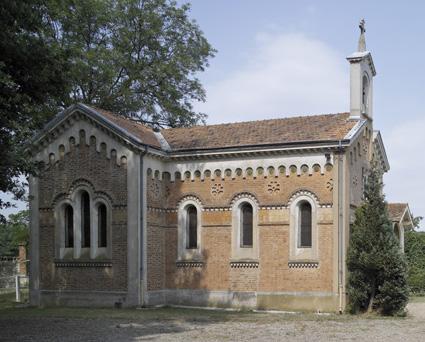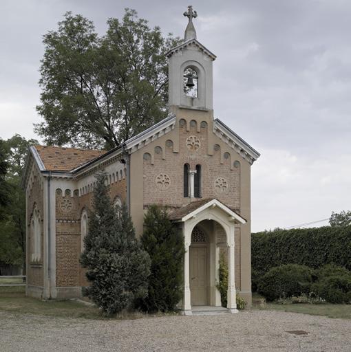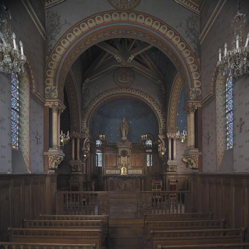 La chapelle présente un plan en croix latine, avec une nef de trois travées et adopte un style néo-roman Elle à une capacité d’accueil d’une centaine de personnes.