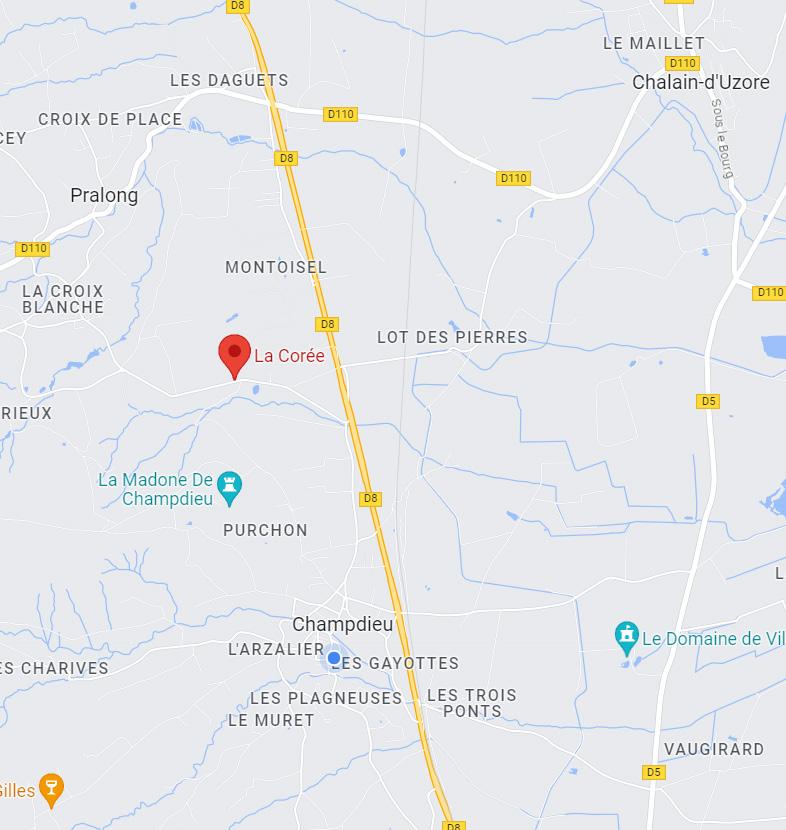 La Corée : hameau appartenant au village de Champdieu, principalement entouré de champs et de verdure -> cadre calme et reposant