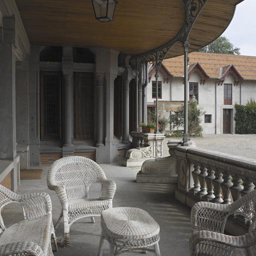 balcon-galerie ou aître devant la partie habitation des domestiques (avec garde-corps à balustres en bois et consoles en volutes de fer forgé)